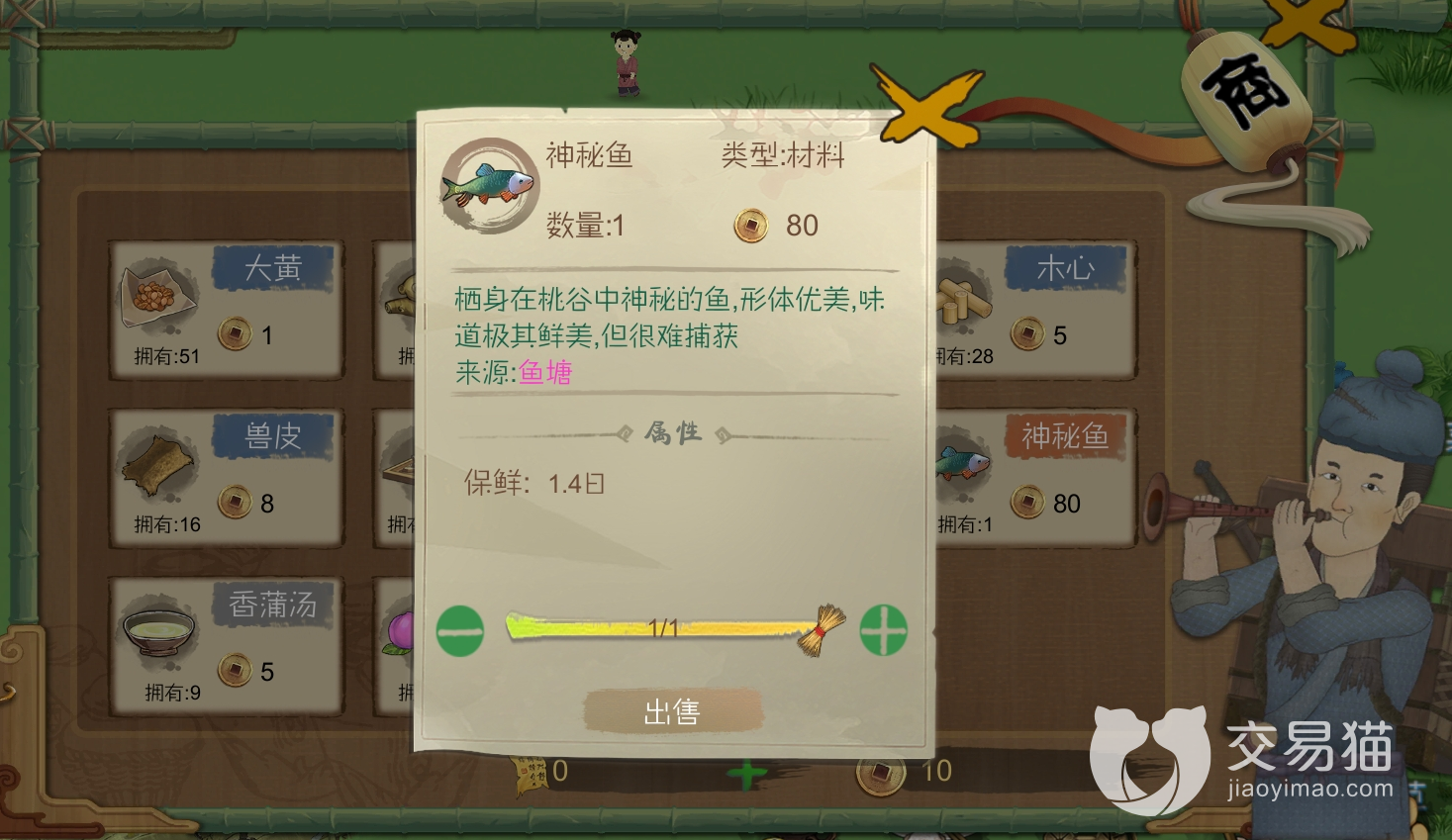 除了购买东西外,还可以在他那里出售物品,例如有的玩家就在某个钓鱼台那里收获到了一条神秘鱼,它的体型优美,味道非常的鲜美,并且很难捕捉到。只要在商人那里进行出售就能获取到对应数量的铜币。