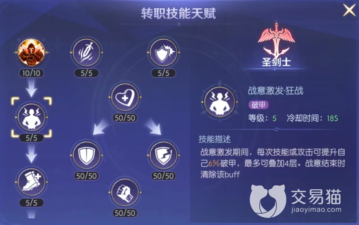 圣剑士更加侧重于输出方向,转职后拥有专属技能战意激发,使用后在8秒钟的持续时间内可以提升战士的破甲属性,以及提升5.5%对玩家伤害,12%对boss伤害。非常简单粗暴的效果,没有过多的公式计算,直接将伤害能力提高了一个层次,除此之外圣剑士还具有其他输出天赋。例如战意激发狂战和战意激发疾步,前者可以在持续期间内,每次攻击附加破甲效果,最高叠加4层,后者能够在持续时间内大幅提高移动速度,这样远程想要拉开距离会非常困难。