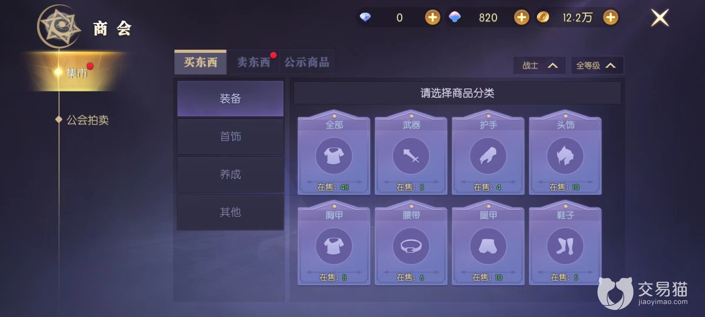 在主界面的上方可以看到商会的图标,点击进去后分为了集市和工会拍卖两个大的选项,其中集市是最主要的玩法。集市中可以自由进行道具买卖,如果想要购买东西,则点击对应选项,可以看到有装备、首饰、养成和其他4个大类。在装备中所有的商品都按照位置进行分类,包括武器,护手,头饰,胸甲等,只要点击对应的选项就可以查看到所有正在出售的对应武器。