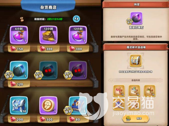 1、杂货商店:钻石主要花费就在这里,不过要注意不要乱花。在游戏前期阶段,折扣锤子,高级抽奖石、许愿币、橙色契约都是必买道具。如果平时积攒的比较多,那么打折圣水也可以选择性购买。总的来说就是只卖打折商品,以及金币商品。
