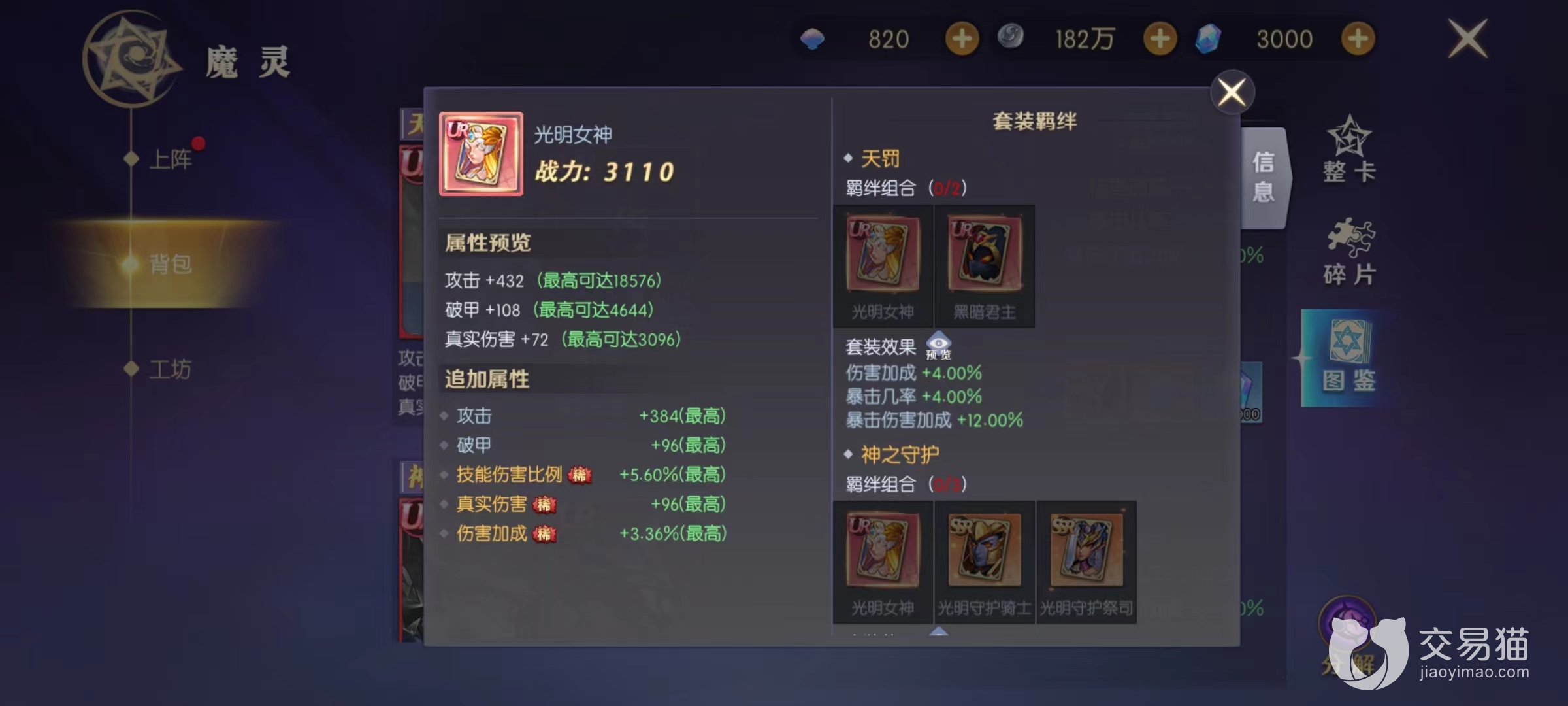 目前最为顶级的魔灵卡牌组合为天罚,神佑,神之守护和光之守护,黑暗之力等,分别由光明女神,黑暗君主,冰原狼王,冰霜巨魔,光明守护骑士,光明守护祭司,黑暗之力,黑暗之火等卡牌组成。一旦搜集成功,能够大幅提高角色的攻击力,真实伤害,破甲值,真实减伤,防御力等一系列属性,此外收集成功后还会奖励深渊秘宝,大量贝壳和魂晶等。