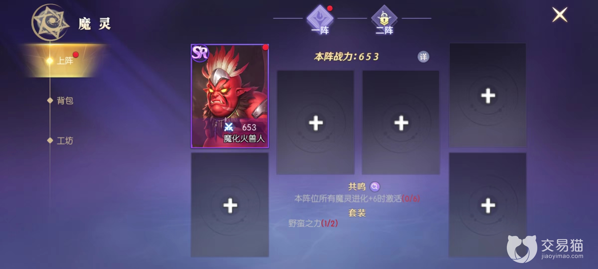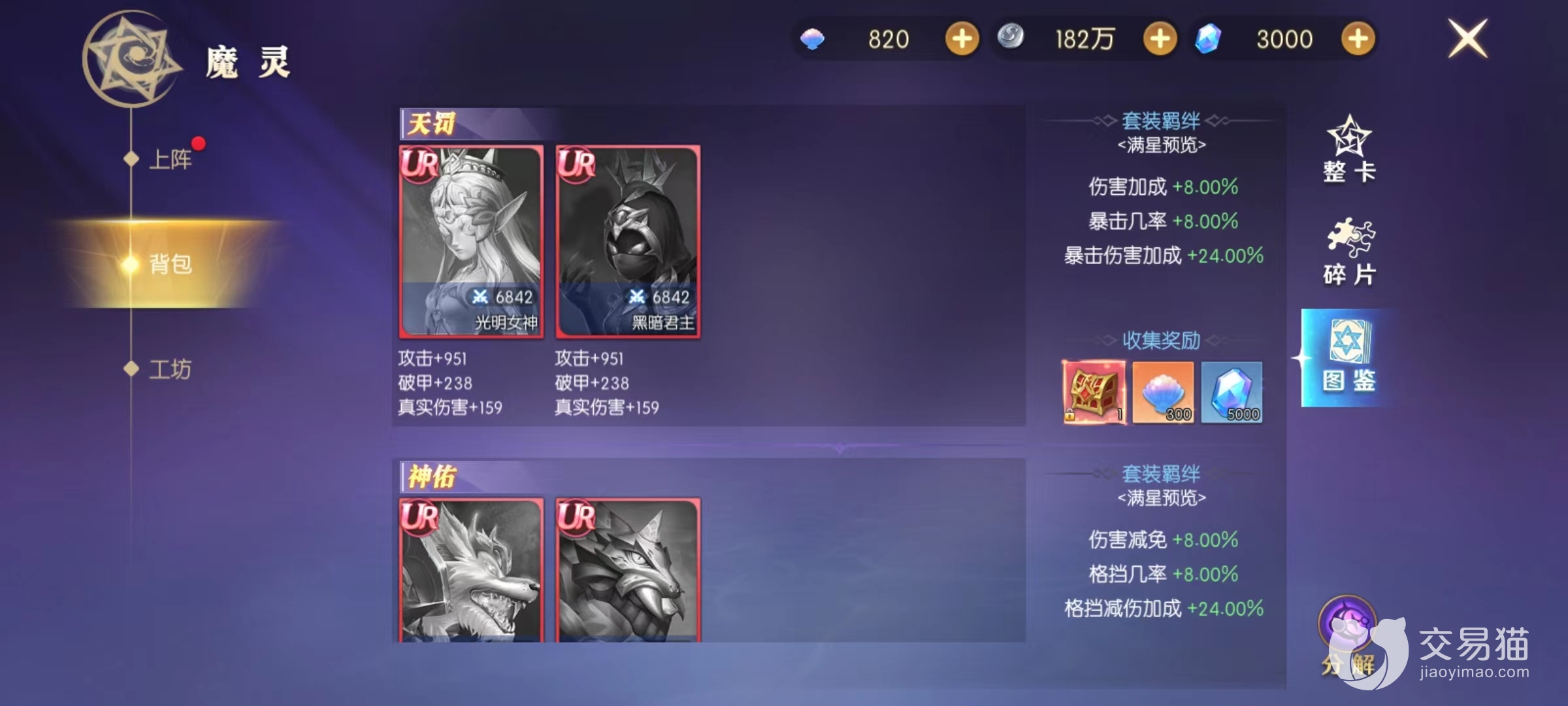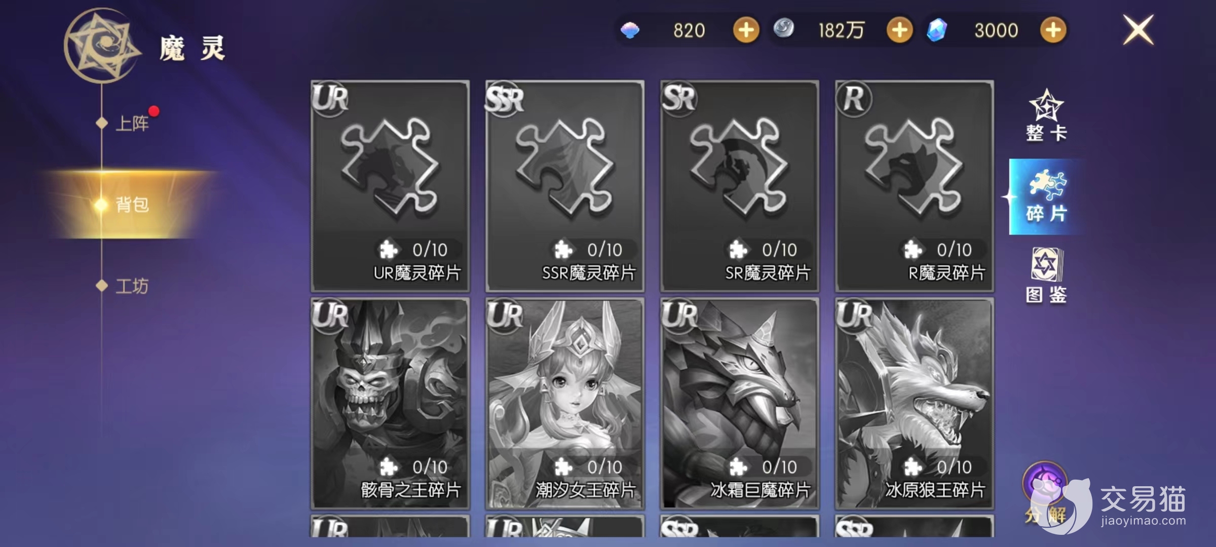 首先打开魔灵界面,分为背包和工坊两个选项。背包中主要显示当前已经拥有的魔灵卡牌碎片以及查看完整图片,目前卡牌根据品质分为蓝色卡牌,紫色卡牌,橙色卡牌和红色卡牌,对应品级和宠物完全一样,最高等级为UR级。只需要收集10枚同名魔灵碎片就能合成一张完整卡牌。