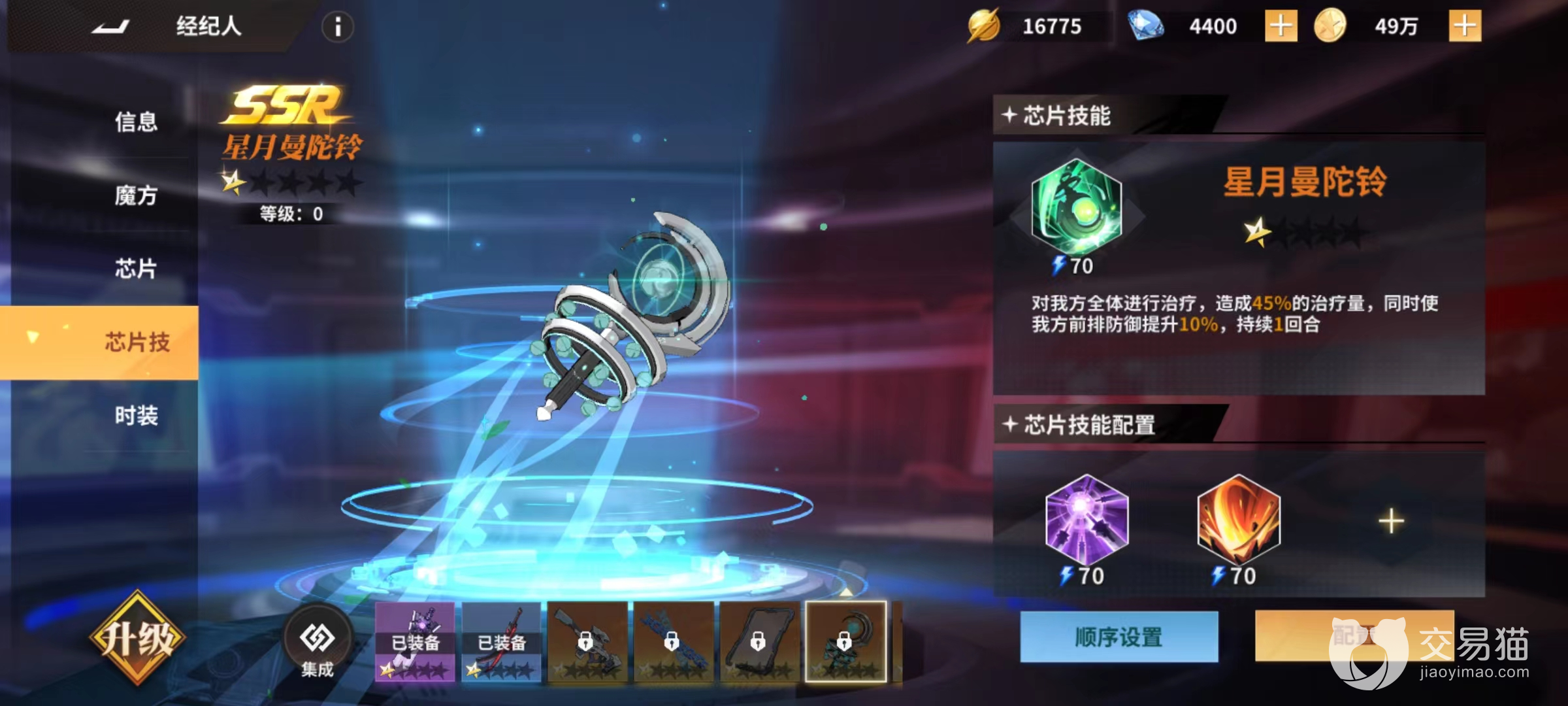 第4个是星月曼驼铃,属于治疗技能,对我方上阵全体格斗家进行回血,同时提升前排格斗家的防御值。这是一个非常好用的辅助芯片,如果上阵的格斗家没有辅助和加血效果,那么这就是很好的补充。