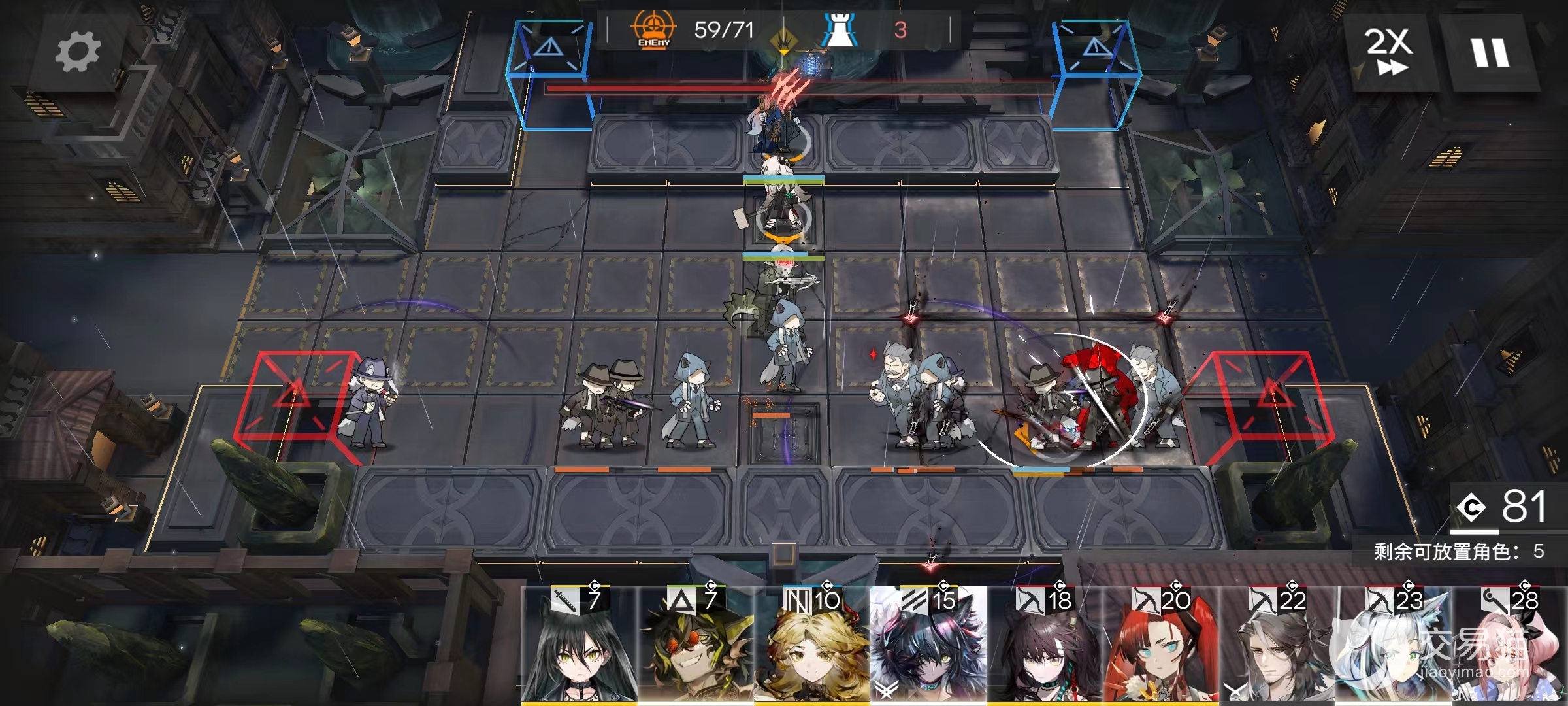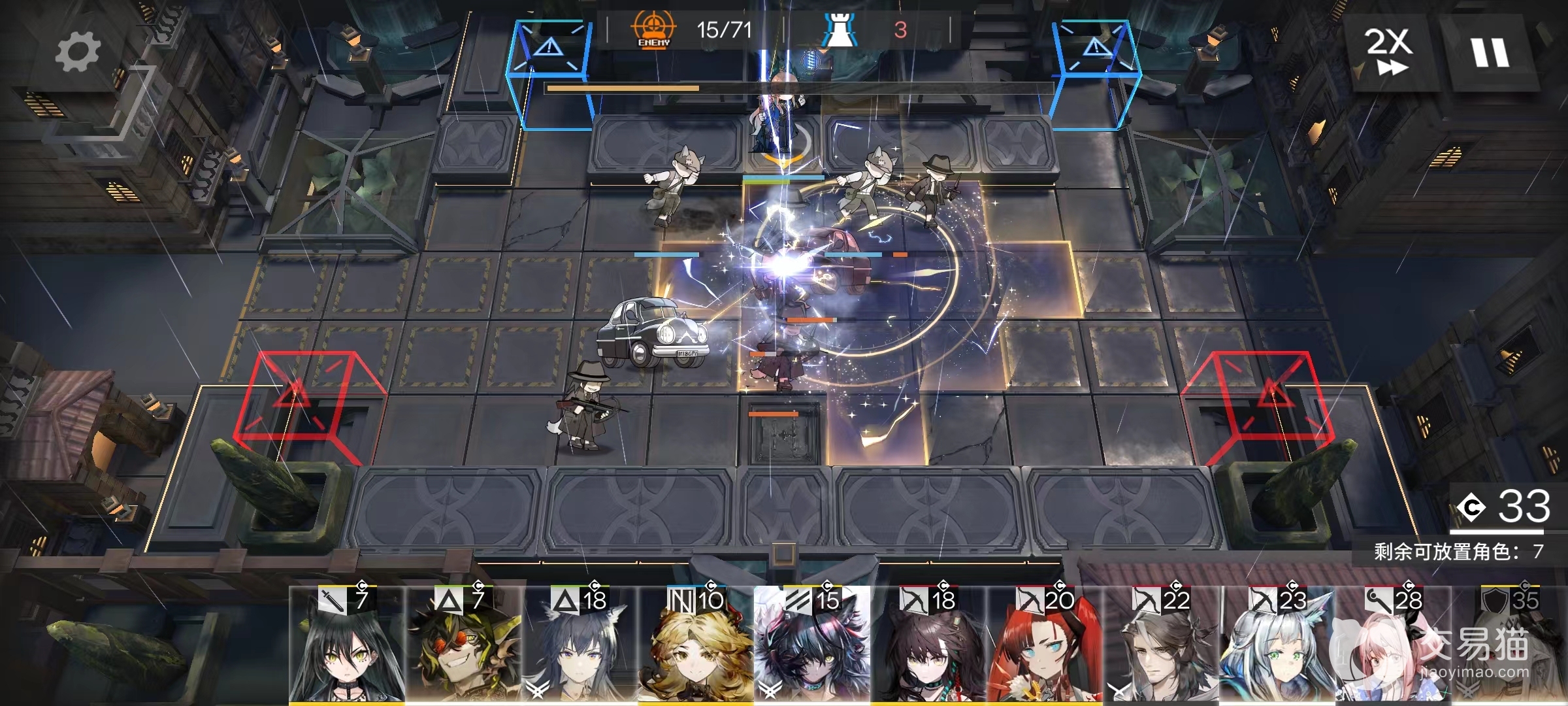 进入游戏之后,开局左右两侧会有两个杂兵,用缄默德克萨斯将他们处理掉之后,有足够的费用就部署异客。