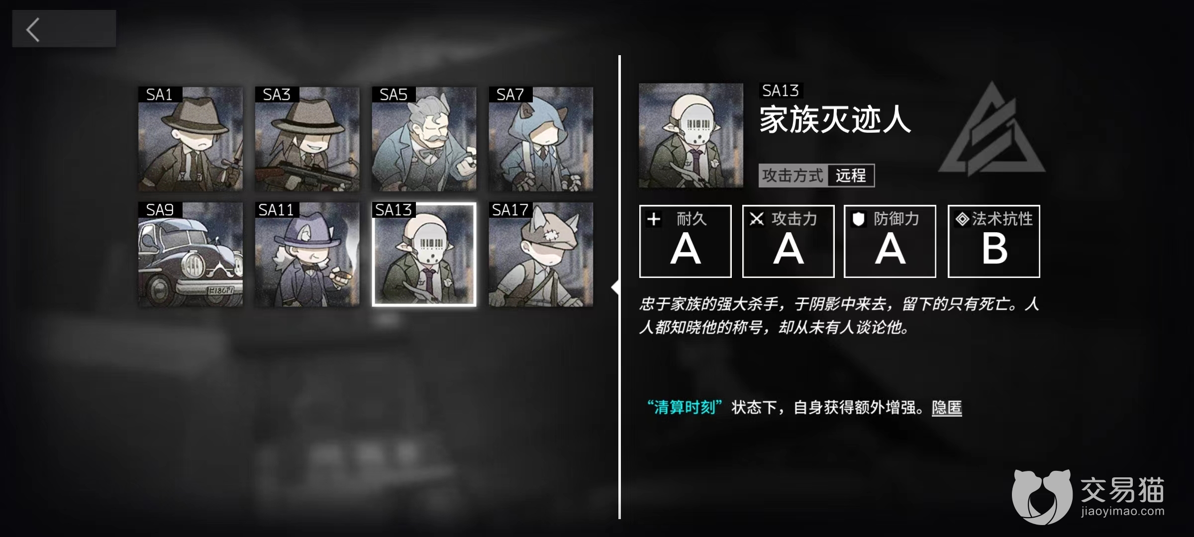 家族灭迹人,家族中负责处理黑暗事件的人,他们只会在清算时刻下出现,每当进入清算时刻,地图中就会出现一名家族灭迹人,在清算时刻时,家族灭迹人的面板会受到额外增幅,这让耐久,攻击力,防御力本就有A级别的他更难对付,常态下家族灭迹人有隐匿效果,要对他造成伤害,要么有破隐能力,要么只能阻挡强制破隐。