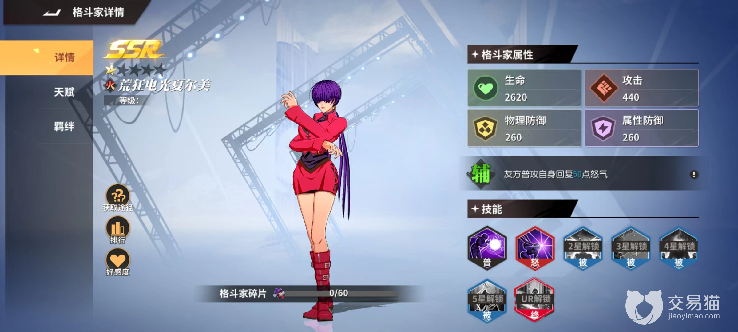 荒狂电光夏尔美属于辅助型角色,怒气技能伤害对方前排角色,同时能够为所有伤害目标附加惩戒之雷状态,被该状态所影响目标受到伤害增加,最多能够叠加两层达到40%效果。达到五星时解锁被动雷之献祭,在战斗开场就能为敌方全体格斗家施加一层惩戒之雷,在这一套狂暴输出阵容里夏尔美这一技能效果增幅非常巨大。虽然不是伤害最高,但是却是不可或缺一员。