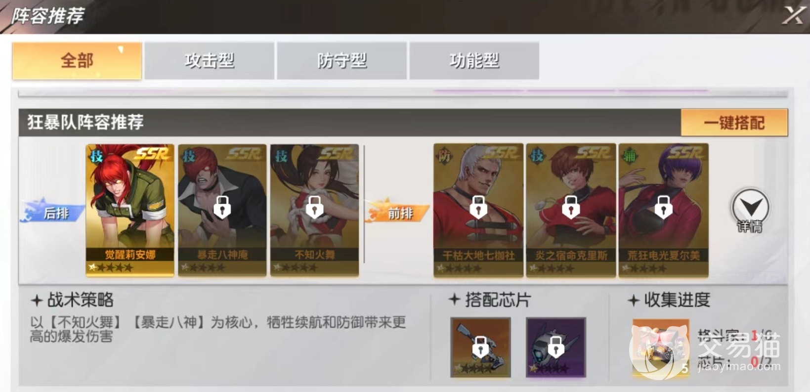 在格斗家角色选择上,小编推荐觉醒莉安娜,暴走八神庵,不知火舞,干枯大地七枷社,炎之宿命克里斯,荒狂电光夏尔美。其中七枷社、克里斯和夏尔美放到前排,莉安娜,八神庵和不知火舞在后排输出。最主要输出核心就是不知火舞和暴走八神,通过牺牲队伍续航能力和防御方面属性换来高爆发伤害,虽然很极端不过却能取得很好伤害效果。