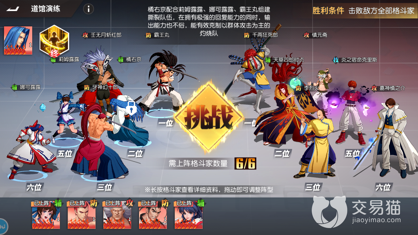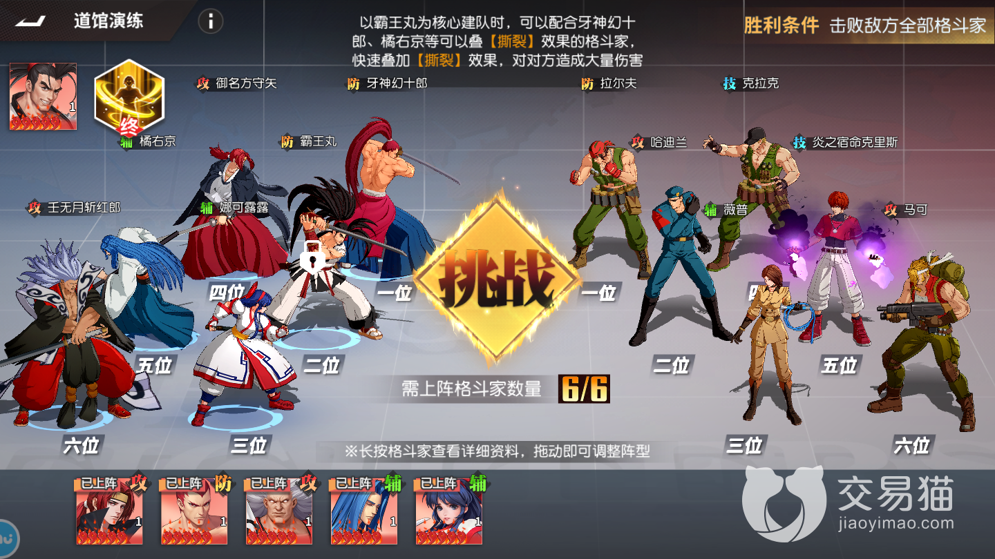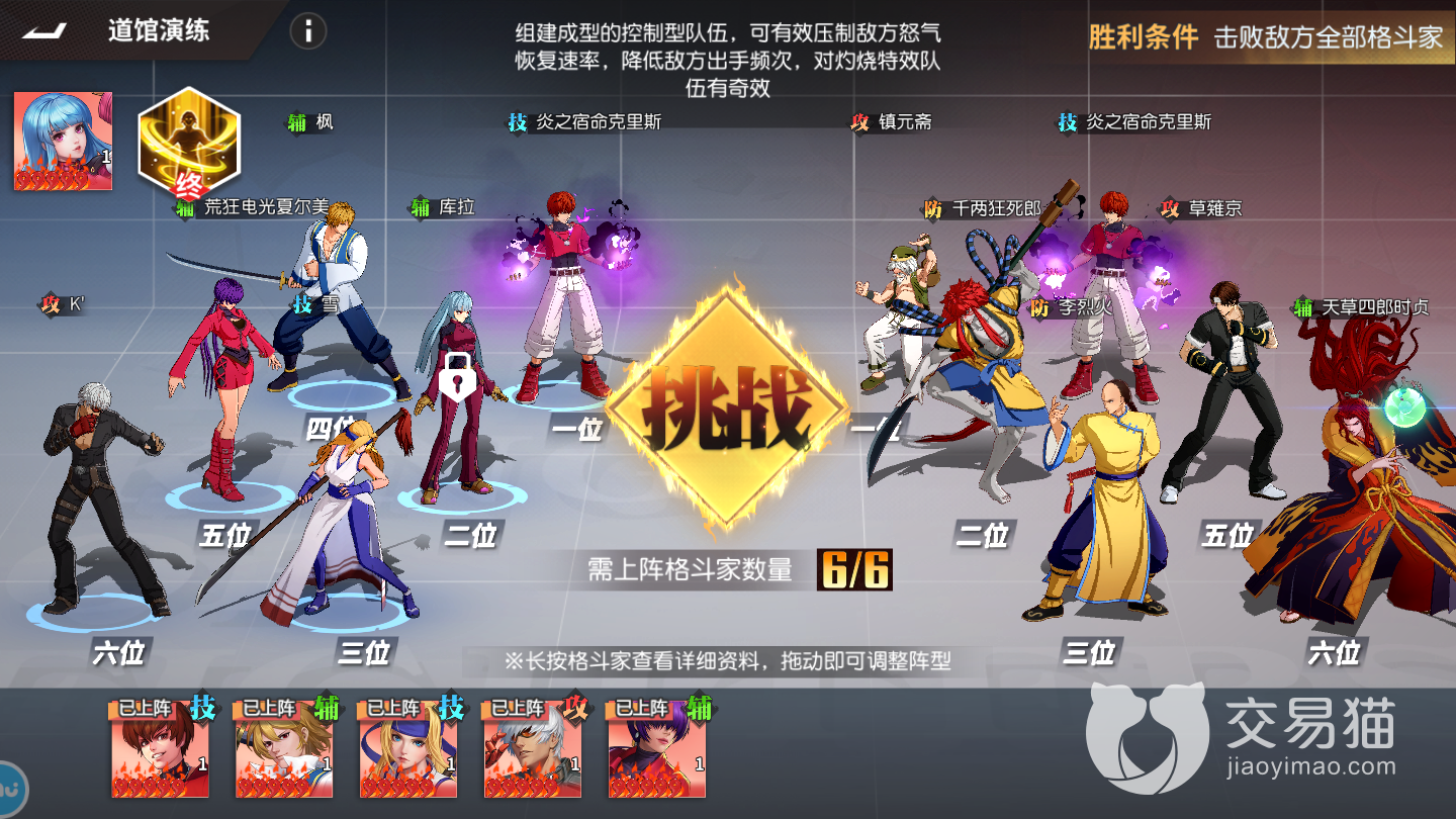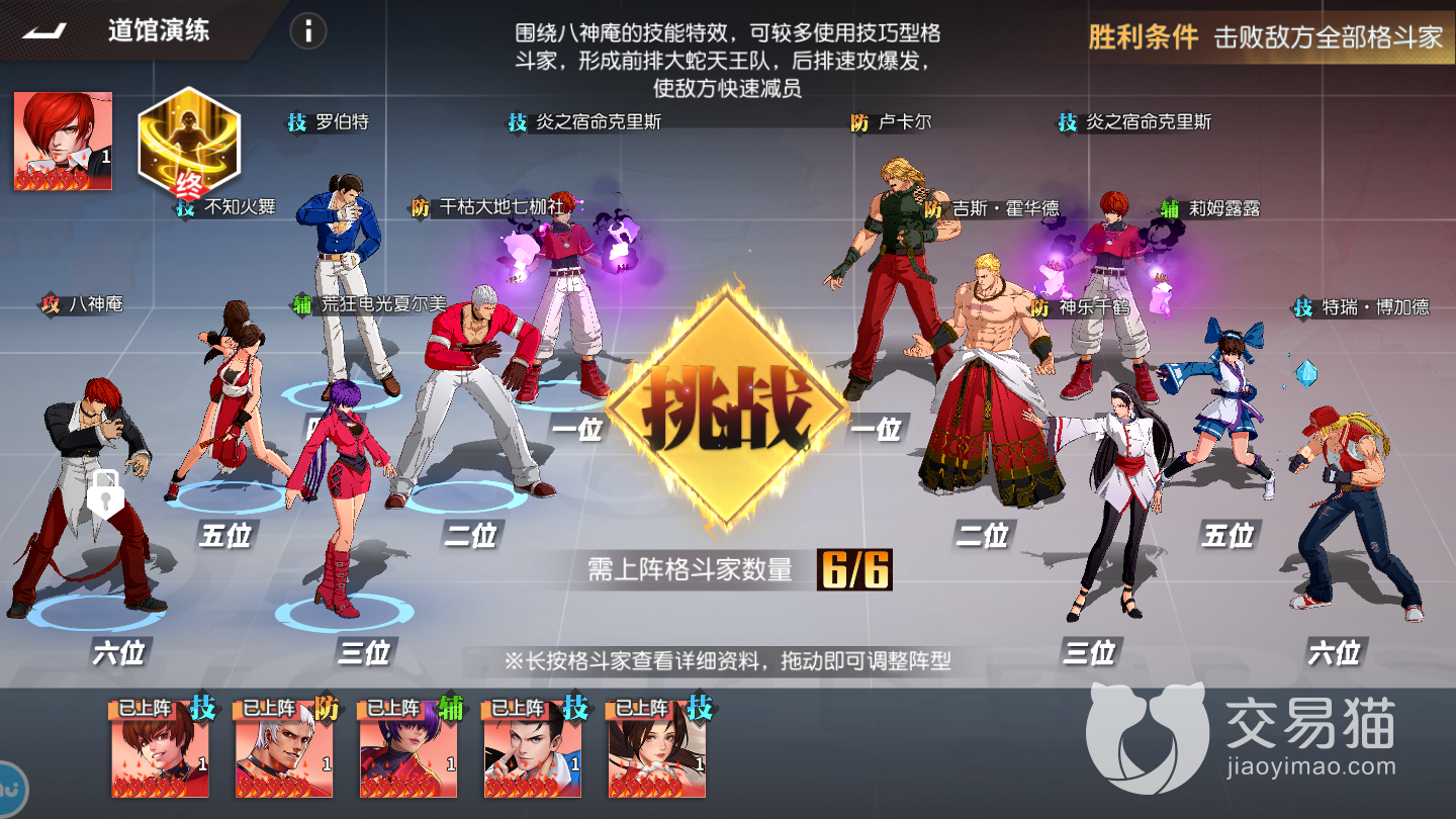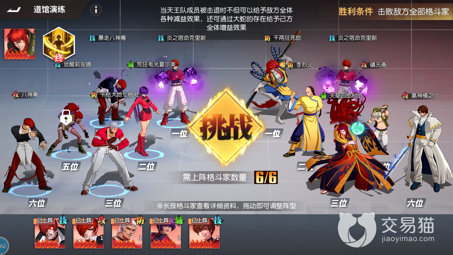 然后就是玩法特殊的八神队伍了,使用大蛇护卫三人组合加上罗神和火舞可以说是比较有针对性的队伍了,克里斯的加怒气能力可以八神快速进入状态免疫所有减怒干扰,并且追击对面血量最高的角色十有八九是对方队伍的核心,凭借八神强大的杀伤力可以快速破坏对面的阵容,而且罗和火可以使用大范围的伤害削减对面后排的输出能力,缺点是这个阵容的坦度不够而且没啥续航自保能力,八神一旦猝死游戏就结束了,好处就是角色都是比较好培养的想克和火都是玩家比较好搞到的免费角色。