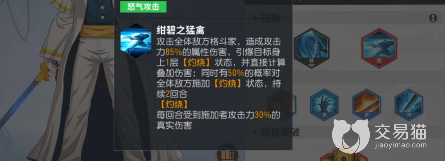 上图是此阵容大体成型的状态,其中天草的主要作用就是给敌方目标施加灼烧相关DEBUFF,且几乎所有的功能都需要通过灼烧来触发,所以该角色是直接与火队绑定的。在对方目标处于灼烧状态时,对我方输出的能力会大幅下降,且削弱各项恢复能力,受到我方攻击时的伤害也会增加,通过这些效果为整支队伍带来巨大优势。