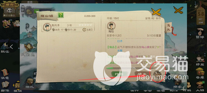 除了在自家桃园中的商人那里购买种子之外,还可以先派遣村民去往外地进行探索,在这个图中就会遇到有商人的图标,孩子需要点击它就可以和那里的商人进行交易了,有些地方玩家还可以获取到大豆的种子,购买一份的金额是两个铜币。