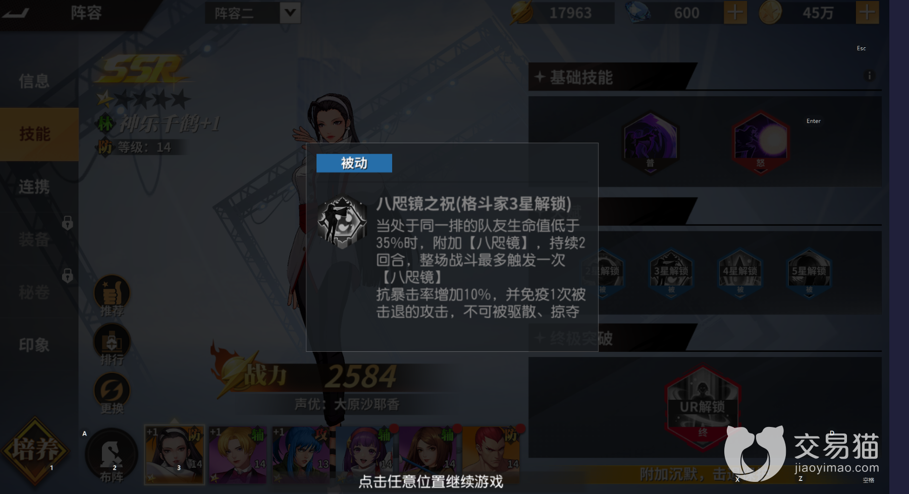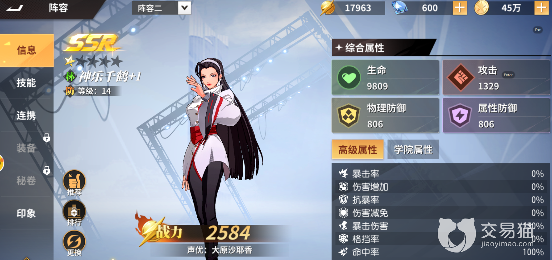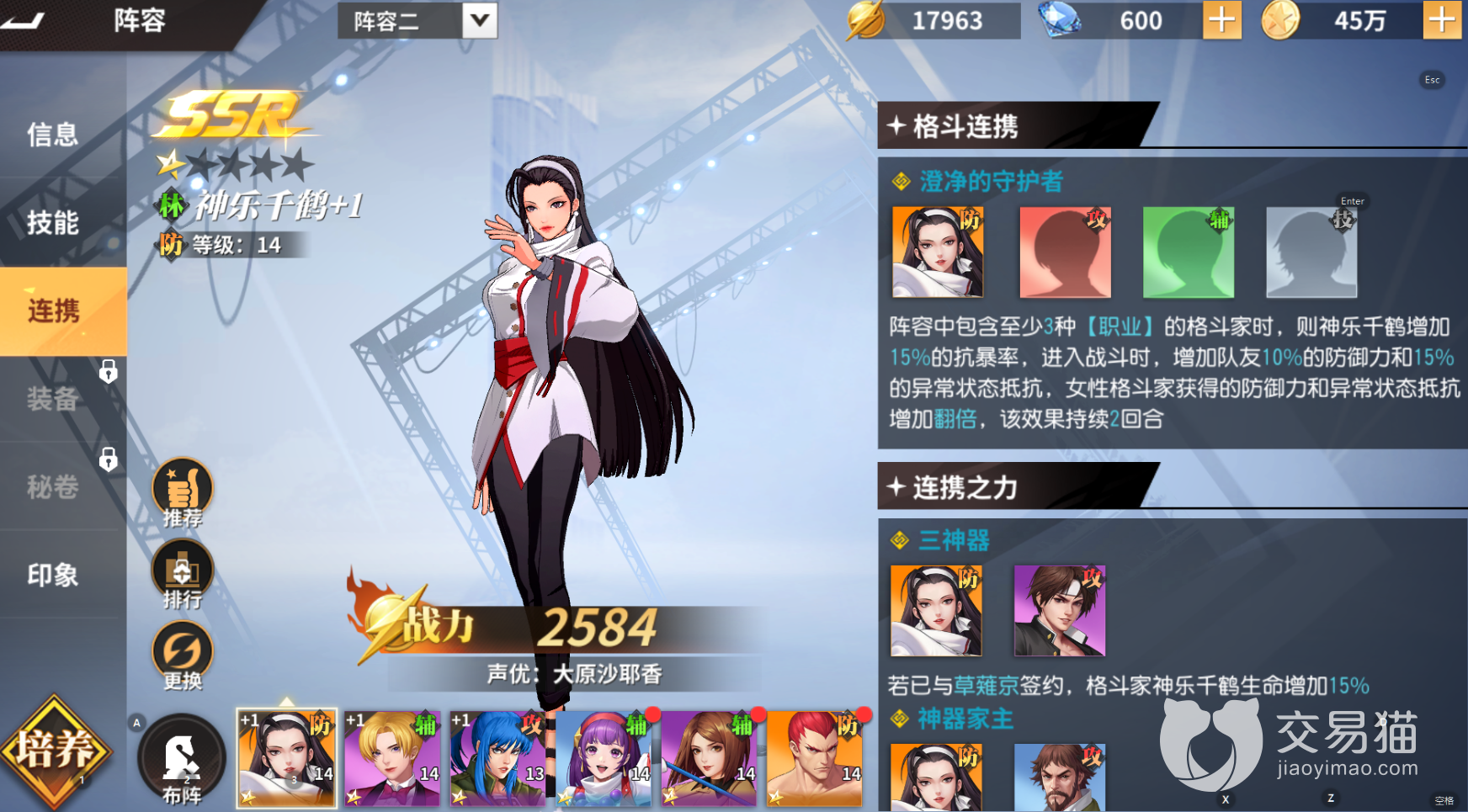 实战中,玩家可以通过千鹤组成一个女子队。配合麻宫雅典娜和不知火舞等角色,就可以发挥出一个顶级前排的实力。而且千鹤也比较容易获取,也许是错觉,绝大多玩家在角色抽取的过程中获得了千鹤,就很神奇。