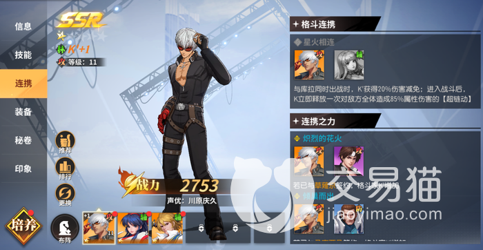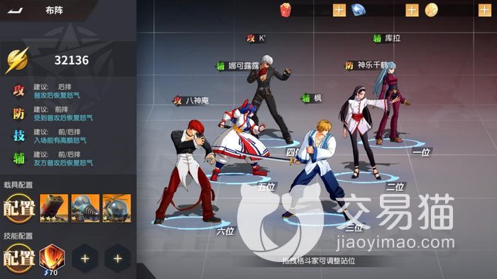 这个阵容最重要的当然是控制类的角色啦,大家可以选择多名控制角色在搭配阵容。比较建议的是大家在这个阵容里面带上三到四个控制角色,这里比较推荐带上八神庵,库拉,神乐千鹤还有枫,这四个角色都是控制类型的。第一个是攻击,第二个与第四个都是辅助,而第三个是防御角色,而且她还可以做前排作用。