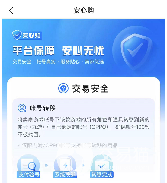 在进行卖号的时候,很多不确定因素都是致命的,尤其是角色被删除,或者被盗用信息,这些情况都会造成卖家的损失,而交易猫就能够很好的避免这一点,只需要通过它的安心购服务,就能保障买卖双方的权益不受到侵害,整个交易的流程能够顺利进行。