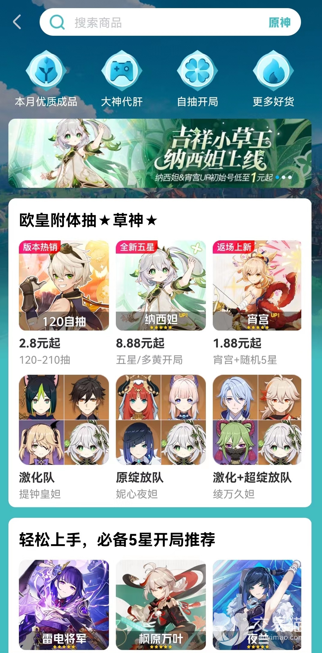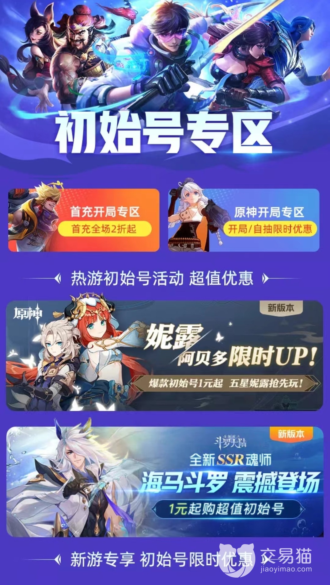 交易猫中不仅出售成品账号,还有很多特殊账号能够购买到。例如各种新游戏的初始号,初始号价格低一般都出现在新服中,能够提供一个非常好的开局,对于一些需要抽卡的游戏来说更加关键,类似的还有首冲号,自抽号,开局号等内容。这些账号购买价格相对于成品号要低,很多相当于是消耗品,如果感觉不满意还可以直接更换,以极低的价格就能找到自己喜欢的游戏,很划算。