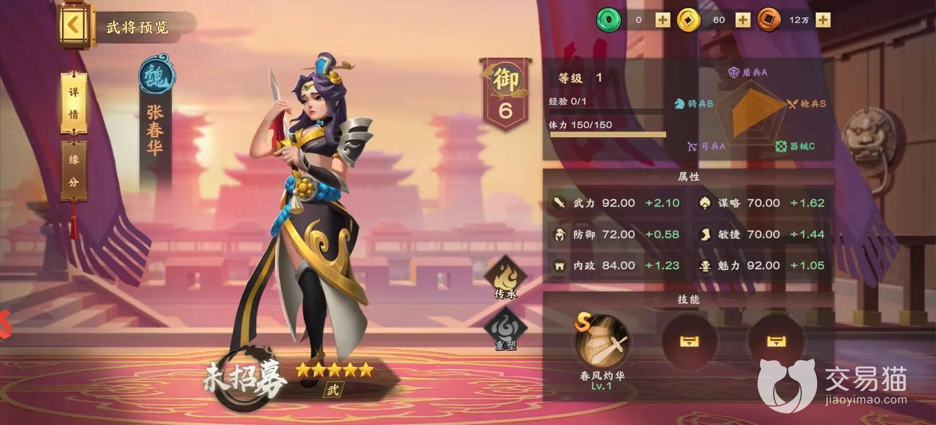 张春华的定位跟凌统是比较类似的,只不过他需要需要一回合的准备时间才能提高暴击率,比他稍差一点,好在有一定的输出能力,作为一个辅助赠送角色还是合格的,没有凌统的话可以练一手。