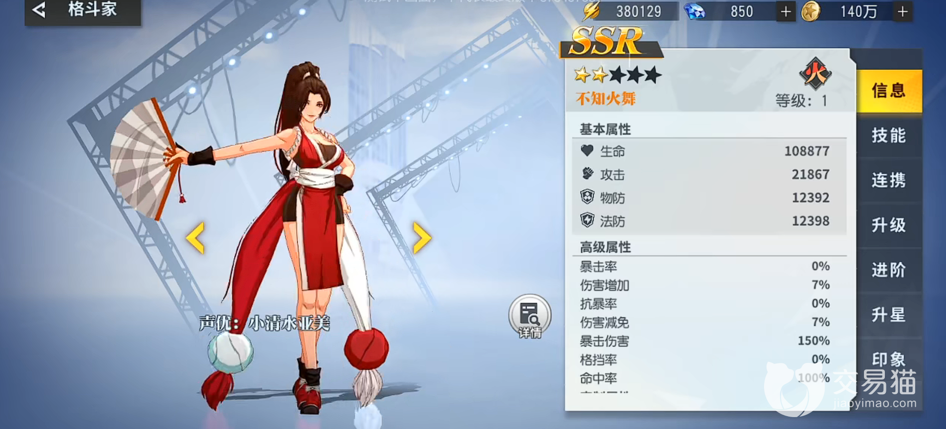 第二个要推荐的是不知火舞,这个角色也是十分的高人气,而且获取方法很低。玩家们只要进行首充就可以获取,上手来说也是非常的好用,因为获取难度低之后,玩家们对她进行升星以及之后技能的提升都有较好的空间。