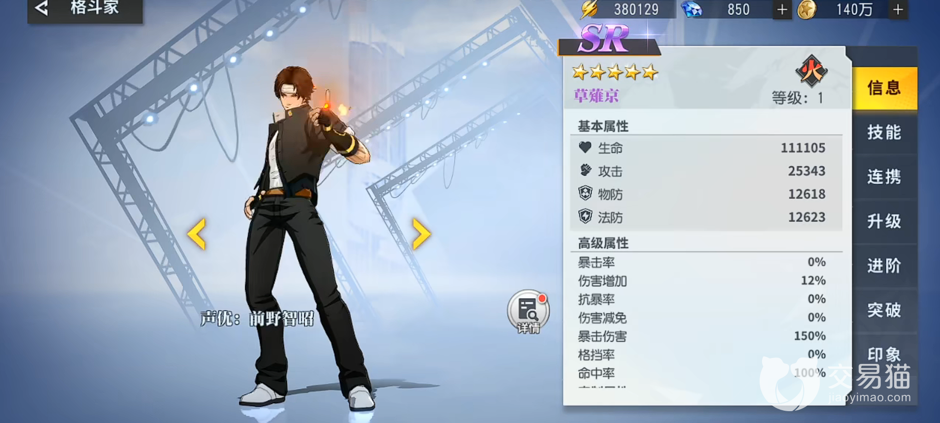 首先,要给大家推荐的就是这个角色草薙京这个角色。它的获取方法非常的简单,属于开局就给我们的三个基本角色中的一位,基本上是我们获得的第一张sr卡,而且可以在之后的开服活动中将这张卡提升至高星,是平民玩家最容易接触到的,也是最容易获取的高稀有度卡片。