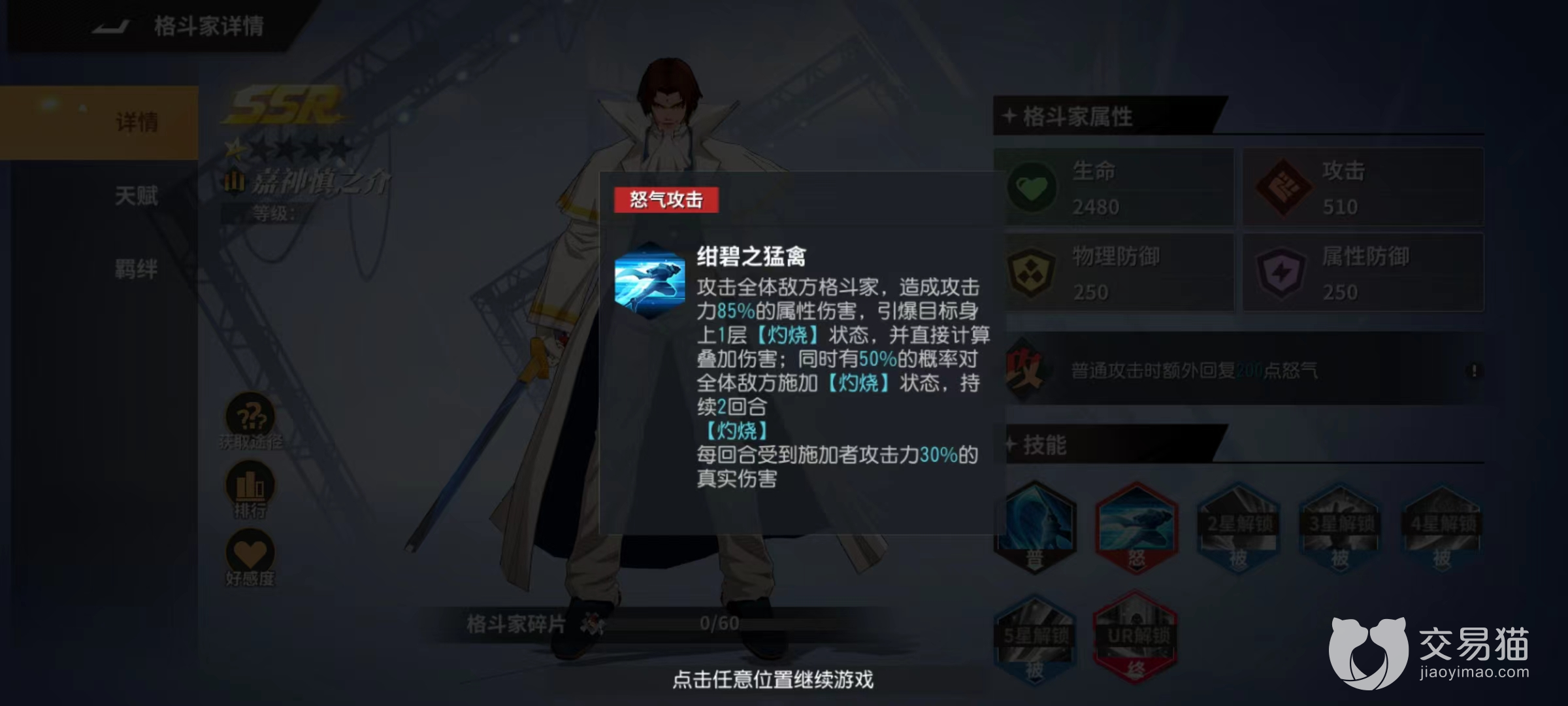 首先需要先了解一下嘉神慎之介的主要技能效果,作为一名攻击型英雄,可以通过普攻来获得怒气,普攻对敌方单体造成属性伤害,属性伤害不同于物理输出,不受对方防御影响。怒气技能可以直接对敌方全体格斗家造成一次伤害,并且引爆身上的灼烧状态。同时有几率为敌方叠加灼烧状态。灼烧是一种非常好用的伤害类持续效果,一旦目标被灼烧后,每回合都会持续受到真实伤害,真实伤害不受任何防御和属性抗性的影响。