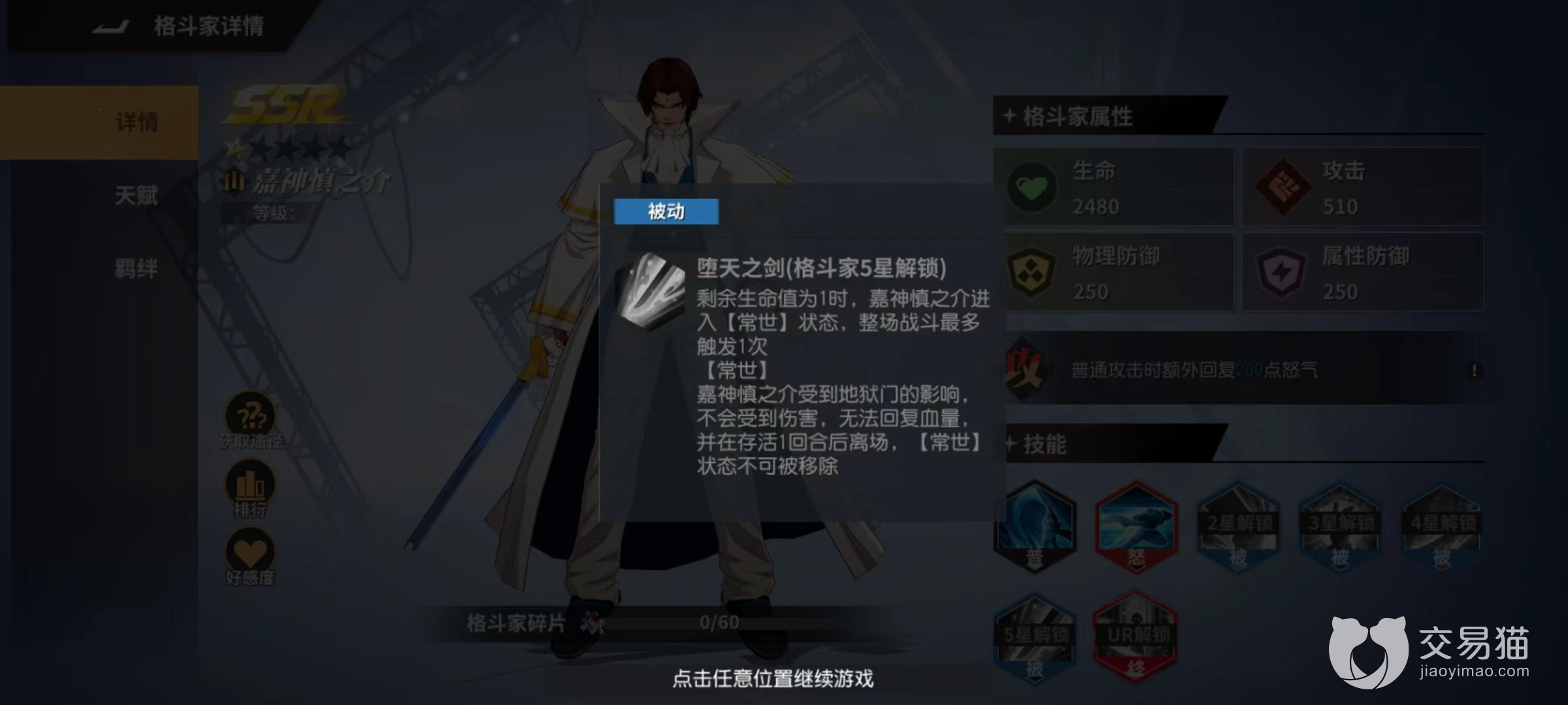 提升到二星时激活被动勇气,造成的伤害和攻击力提升,达到三星时获得一个非常好用的回怒效果。如果敌方身上带有灼烧状态,并且使用了普攻,那么嘉神慎之介就能够恢复50点怒气,也相当于自身带了一定的回怒效果。达到五星时解锁最强天赋堕天之剑,也是该角色成名技能,当首次生命值降低为1点时,嘉神慎之介不会立即死亡,而是进入到一个特殊状态,在该状态下不受到持续伤害也无法回复血量。强制存在一回合后再退场,这样就使得濒临死亡时额外多了一回合的输出机会。