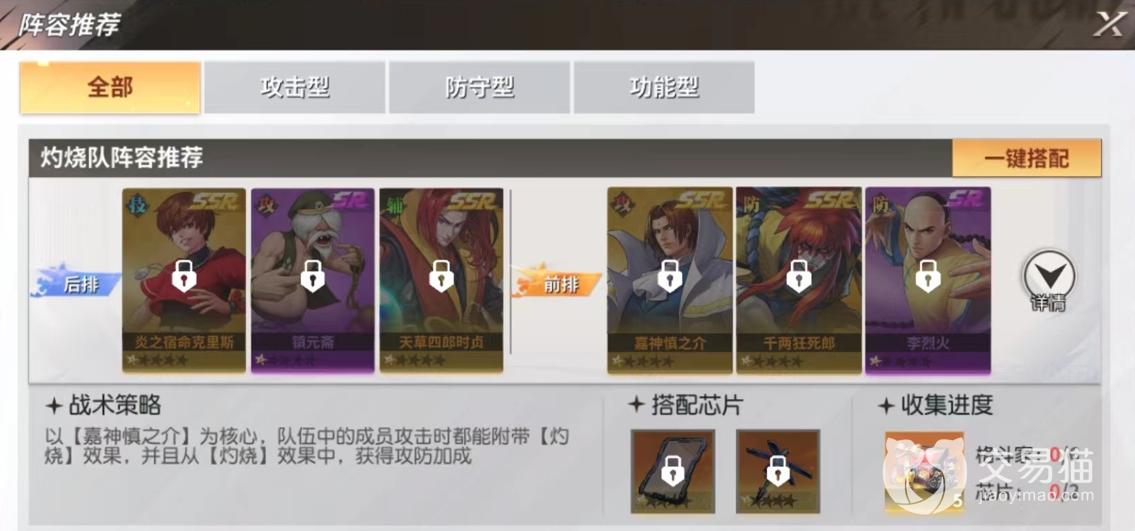 正是有了这些属性,所以嘉神慎之介的搭配也比较自由适合各项阵容。小编推荐的是和千两狂死郎,镇原斋,李烈火,草薙京等组成新手阵容。这一套阵容利用嘉神慎之介和千两狂四狼作为核心。他们的灼烧状态可以相互叠加,使得成型速度更快,而且培养起来也比较简单。其余角色都是紫色品质,培养起来非常节约资源,所有玩家都可以轻松入手。
