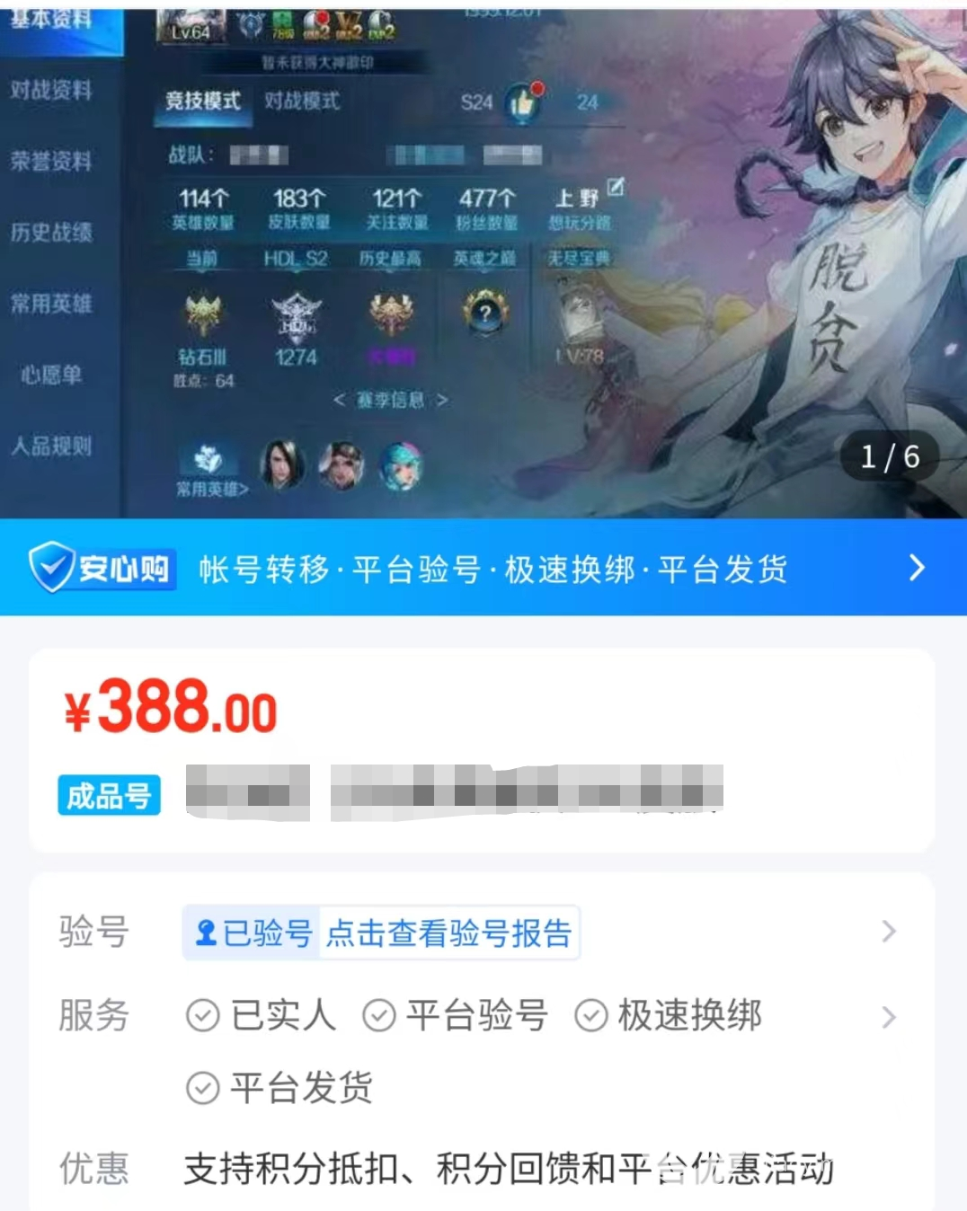 不仅售前可以查看验号报告,买家拍下账号以后还有二次验号的机会,二次验号就是平台客服或者是卖家上号并且截取相应的账号图片,让买家再次确认账号的真实性。
