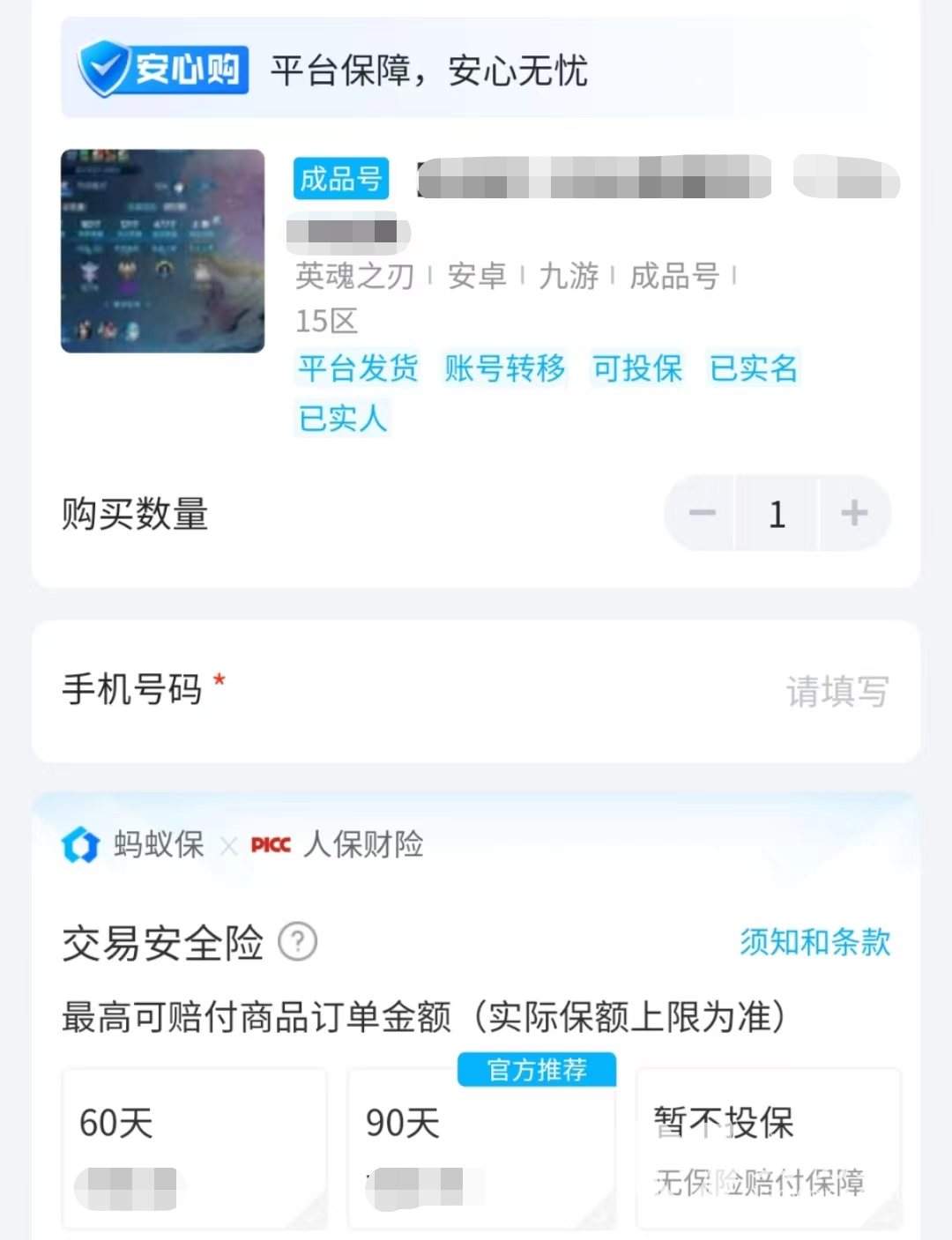 平台对于交易的安全保护是贯穿整个交易过程的,即使交易完成以后,在售后阶段还会继续为大家提供安全保障。只要下单的时候同时选择购买安心购保险,那么就能获得对应时效的保险守护,这样即使对方找回账号自己也能通过平台理赔来挽回损失。