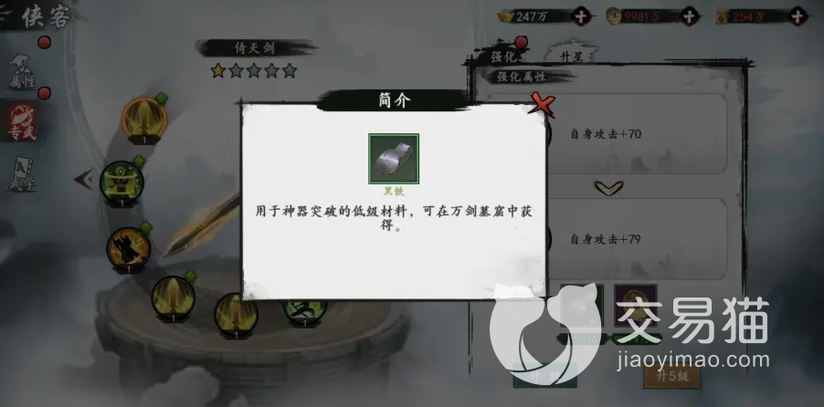 此游中在升级的时候是需要花费指定的材料的,有时候会需要使用黑铁和铜币进行升级,则里的黑铁可以在商店中获取。而倚天剑在四十五级以后升级的材料就需要用到赤铜了,这个材料就需要在万剑墓窟里获取到,以此类推想要升到更高就需要用更珍贵的材料。