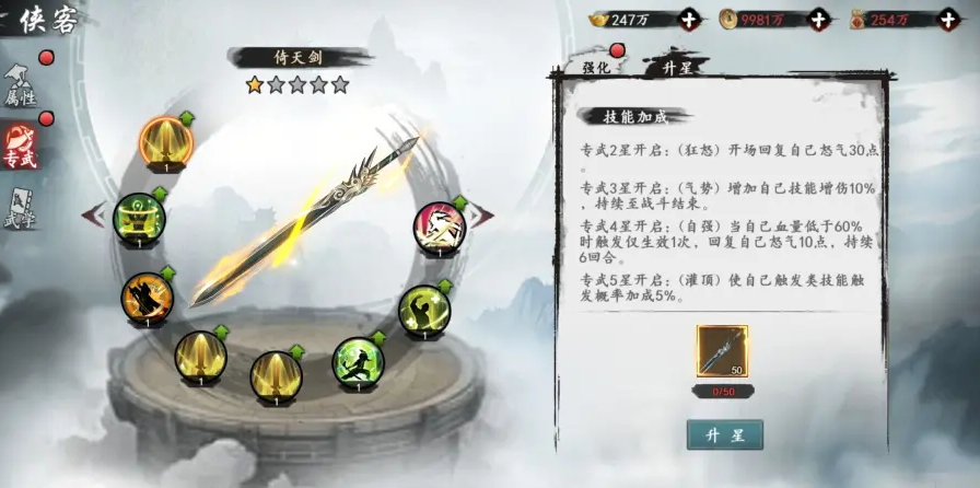 如果在商店中获取到倚天剑就能对这把武器进行星级的提升了,在升星了以后能够对其基本属性和技能对应的提升一些加成。并且还能够为角色本身添加一些属性,团体出站的时候还会有全体的属性提升,总的来说作用还是非常大的。
