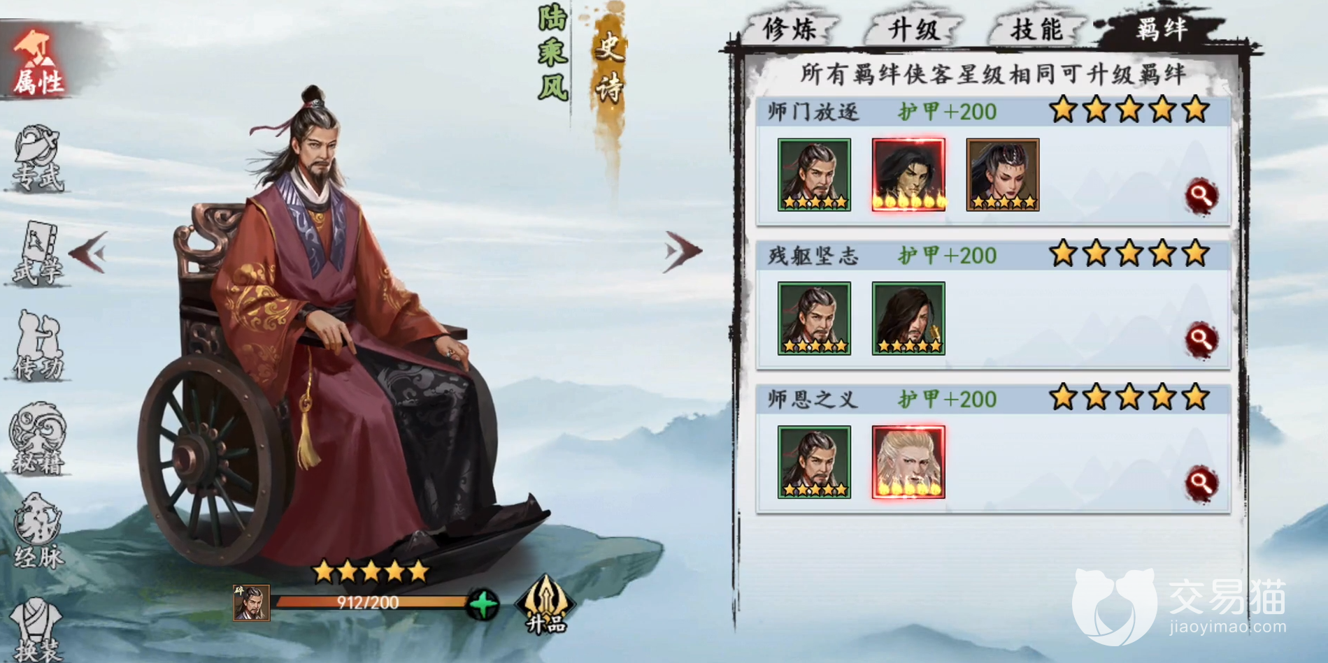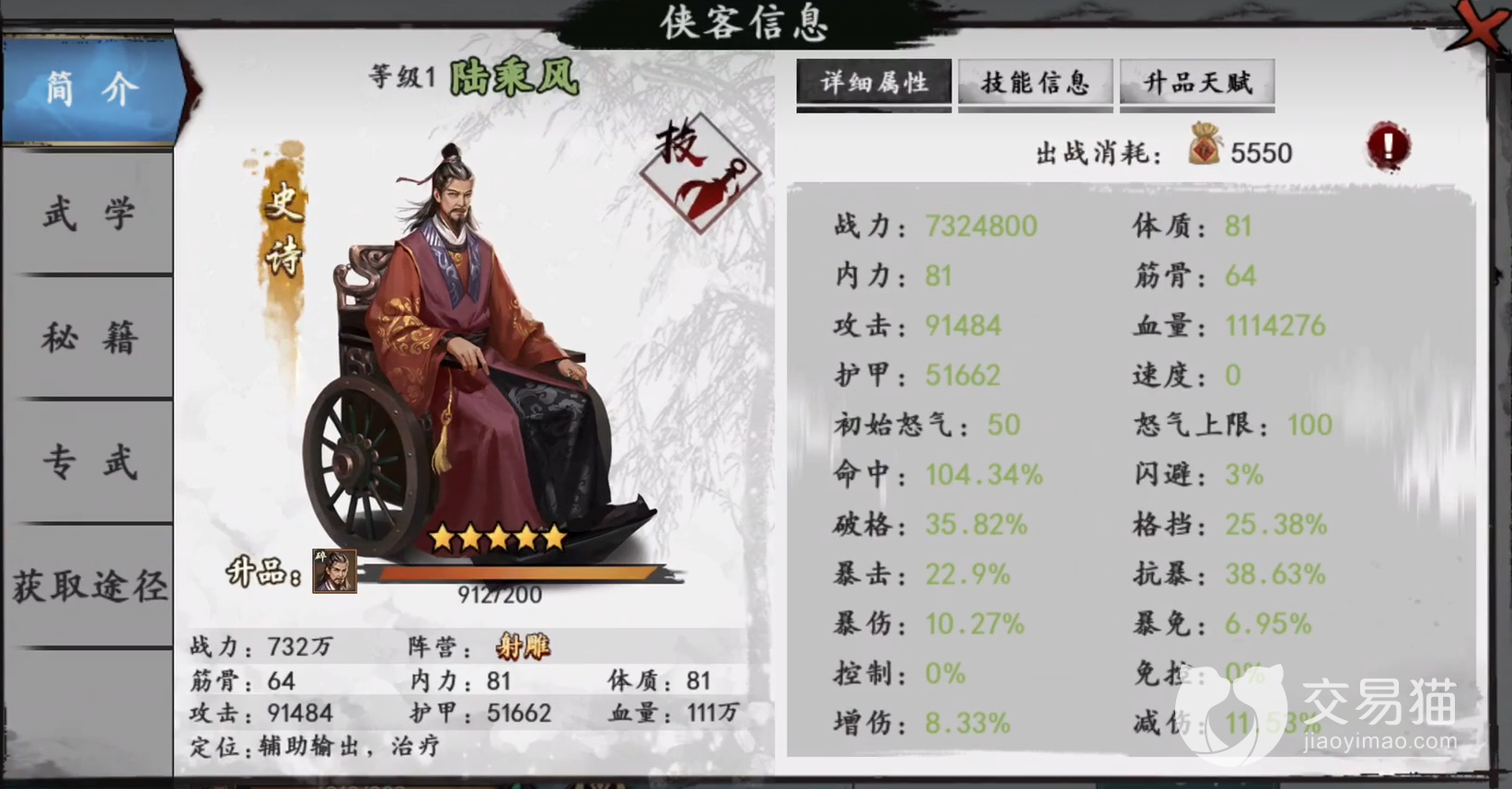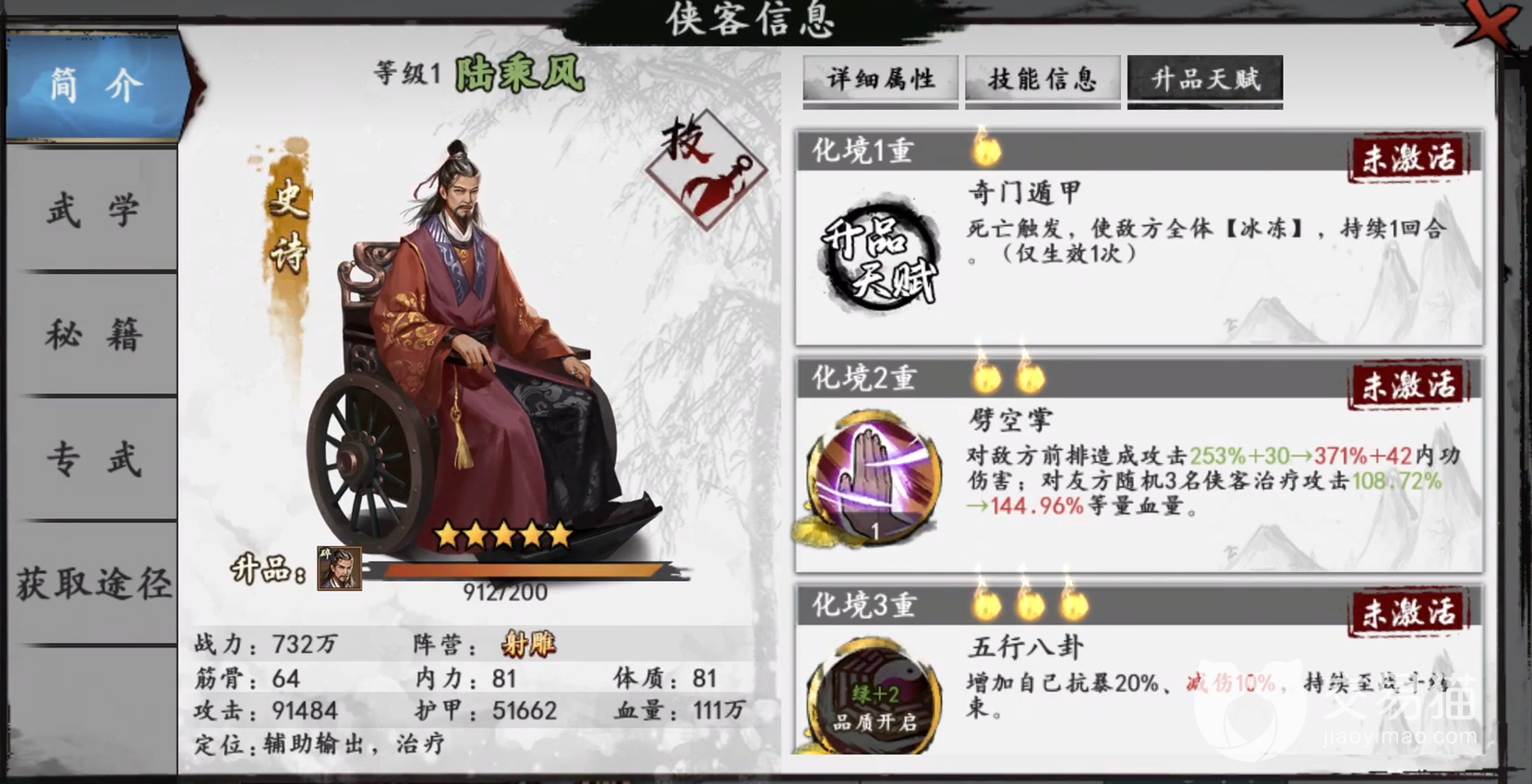首先是基础数值方面,陆乘风的面板不是很强。体质81,内力81,筋骨64。可以说是有些拉跨了,特别是筋骨方面,才堪堪破60,连70都不到。这也直接造成了该角色的对于外功防御的较弱,而且基础的闪避率也不高,简单的来说,本角色属于一个脆皮辅助。