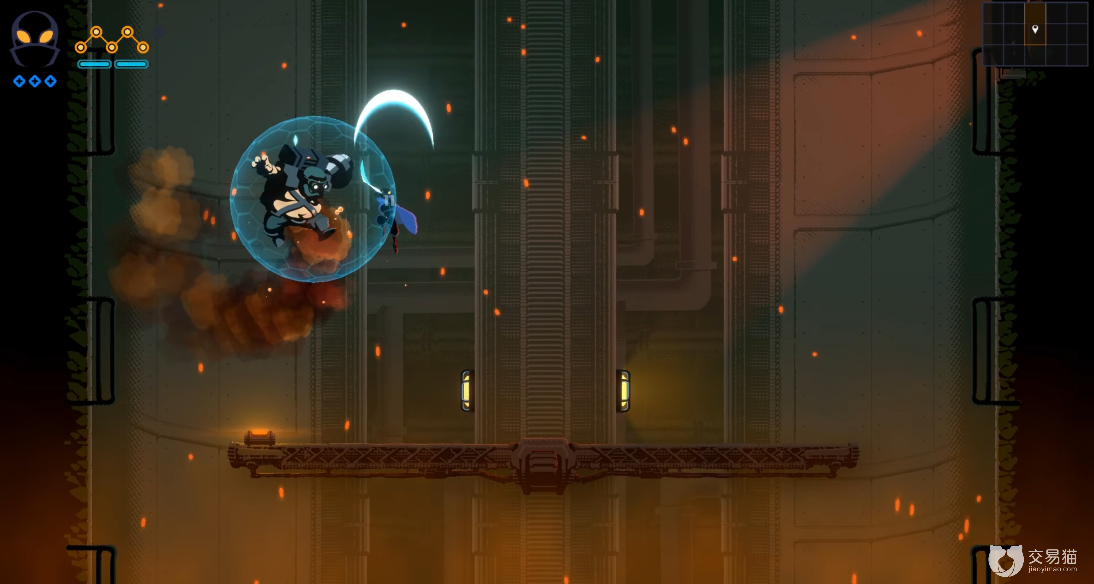 首先是游戏的操作系统,主要是左右移动加上跳跃是这款游戏的基础然后获得攻击使用无形的赛博科技利刃攻击前方的敌人,玩家可以操作该角色跳跃攻击和下坠攻击多种组合攻击的方法衔接流畅全看玩家的反应速度,最为核心的就是“滑铲”以及冲刺了,这两个技能的使用是这类游戏共有的特性玩家的熟练度全看这两个技能,高手玩家最为喜爱这些技能因为可以快速过关还能闪避各种伤害可以说是异常的实用了。这款游戏最为特殊的互动仅能就是电子钩锁了,这个技能可以让玩家通过各种无法用一般移动通过的地形还能触发各种特殊的物品,最主要的是这个技能是玩家远程输出的有效手段。