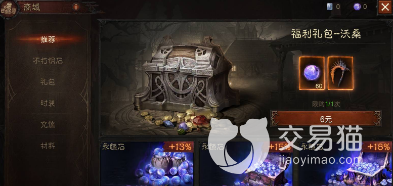 然后就是6元的新手大礼包,这是最受欢迎的。里面有60颗永恒石,可以用来兑换洗练石、不朽钥石、白金。还有一件装备,那就是地狱之火,6块钱就能买到。