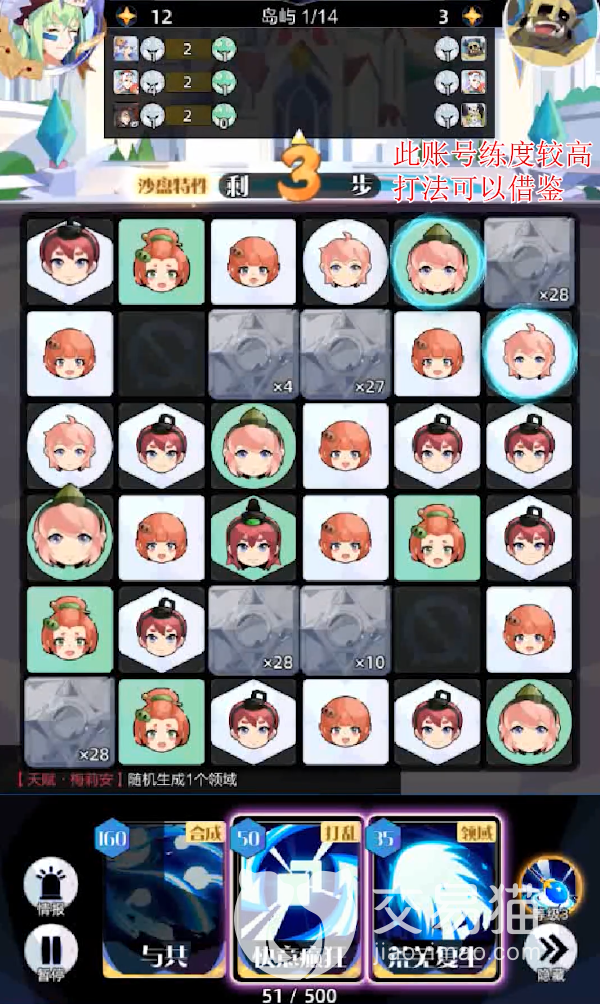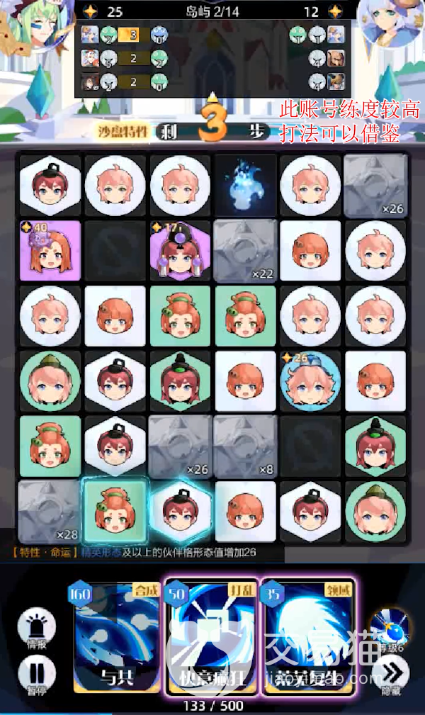 其实所谓的技巧也不是什么特殊的过关方法,只是一些经验之谈。在开始的时候,步数还算充裕的时候,可以先用2到3步将能量攒到300以上,之后可以看情况丢一两个快意。这个时候就要看刷出的绿色的格子,用荒芜苏生。