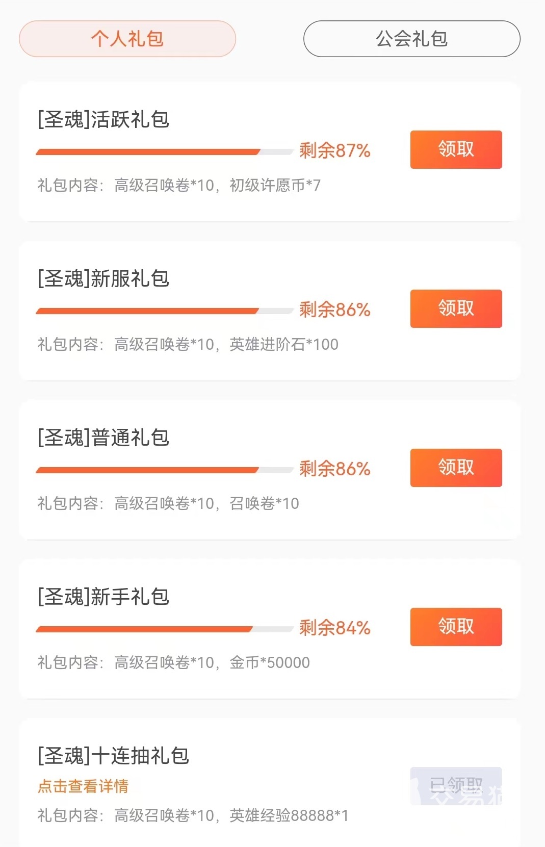 接下来是九游平台专属奖励,需要打开手机端九游,找到圣魂手游专区,从页面中可以看到有礼包选项,点击进去以后会找到5款礼包。这是目前依然提供领取类型,包括有10连抽礼包,活跃礼包,新服礼包,普通礼包和新手礼包。奖励的道具主要是高级召唤券、英雄经验、初级许愿币、英雄进阶石等奖励,这些大多数都是和召唤卡牌以及强化角色相关,对前期非常有帮助。领取的类型和上面所说相同,在点击领取后可以直接选择进入游戏进行复制,更加方便。