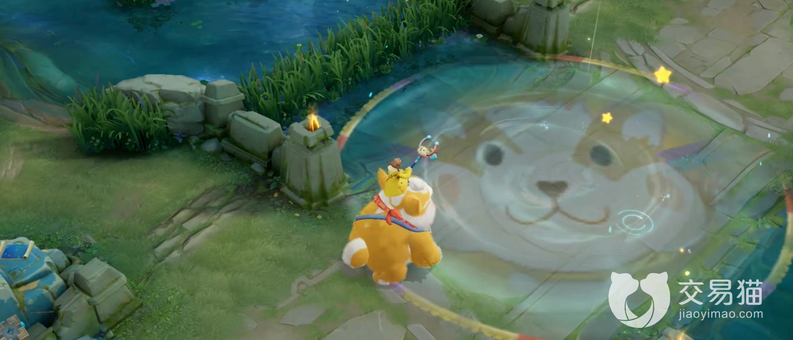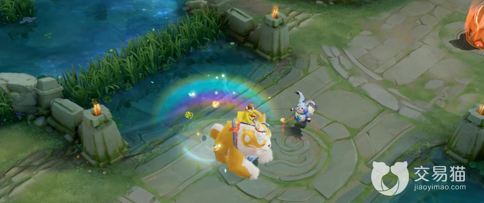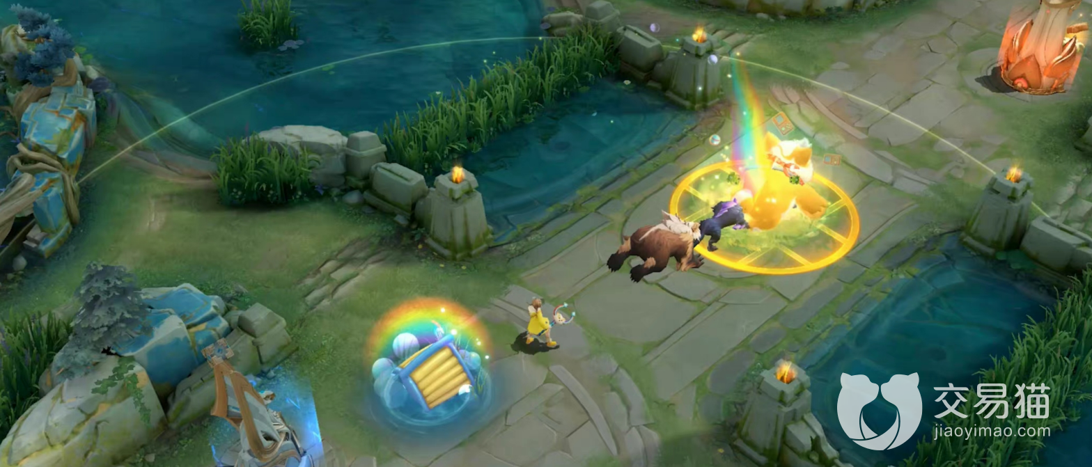 阿古朵触发被动技能,身边出现悬挂着彩虹的气球小屋,伴随着梦幻的星光。放生结束,野怪走进小屋。一技能扔出水气球,特效形成一个有小狗图案标志的小型泳池,命中后还会出现彩虹滑梯,宛如身处水上乐园。