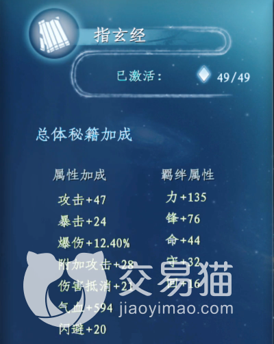 首先小编带大家来了解一下指玄经的作用,指玄经在全部激活的状态下,每造成九次暴击伤害,就会造成一次额外的百分之三百六的攻击加成伤害,这个效果是相当的强力,除了效果,他的基本属性加成也是相当的高,增加47点攻击、24点暴击、12.4%爆伤、549点气血,这个水平堪称神级了,除此它还有羁绊加成,这里就不多说了。