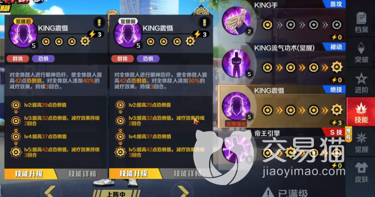 想要组合出更强大的king的阵容搭配,我们可以根据king的整体属性和特性来看。king的技能组主要是以“恐惧值”为核心,他的所有技能都是可以给敌方施加恐惧值的,S技能和被动伤害都是与敌方的恐惧值相关的,同时king的绝技对敌方还有减疗buff。