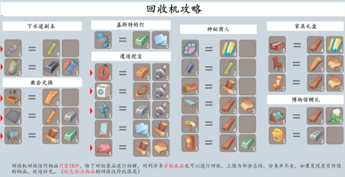回收机会根据物品的等级来进行划分,会有副本物资、挖宝物资、商人物资、家具礼盒等等,不同的物资所能获取到的对应奖励都是不一样的,可以根据下图所示的攻略图来进行判断,更好地获取到自己想要的物资。