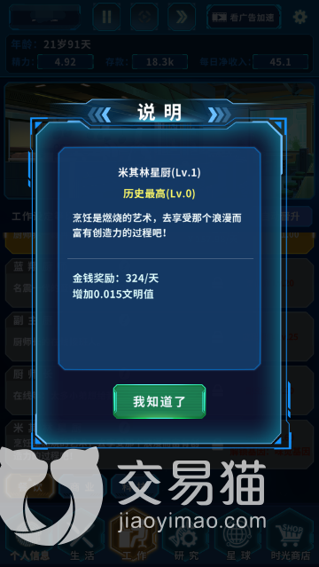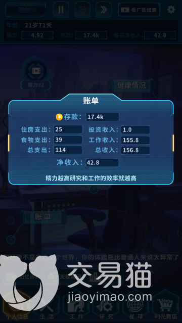 玩家们就可以这样周而复始的不断去提升自己的工作能力,但基础的工作非常有局限性,同时为大家带来的收入也不高 。小编建议各位在工作的同时,也需要将中心放在研究方面,研究等级的提升会为角色带来一系列的变化,从而让工作更加的有效率。自然而然的就会让收入持续的提升。