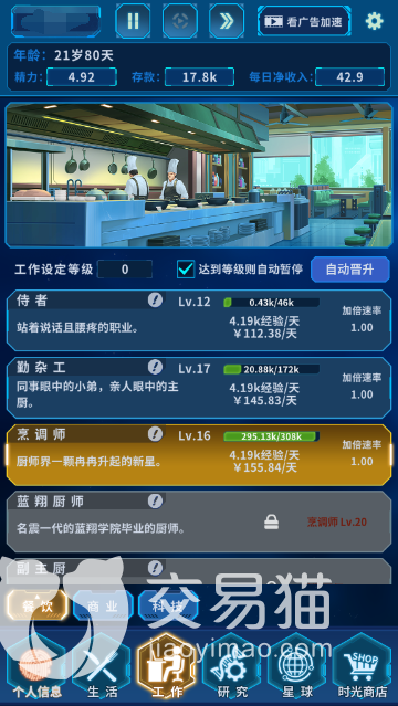 无论玩家们在游戏当中进行多少次轮回,每一个阶段都需要不断的去提升收入,这样才可以帮助大家解锁更多的功能。而前期主要获得收入的条件,就是去进行工作。每当各位一项工作的熟练度等级不断提升的时候,大家就可以选择到一个拥有更多收入的工作,在升级的过程当中优惠解锁下一个不错的工作。
