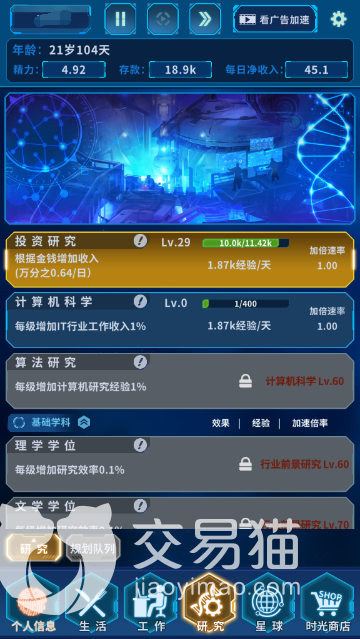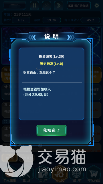 当然,各位也可以直接在研究中选择“投资研究”,该项目在等级提升的过程当中,会直接为玩家们提供额外的每日收入,建议大家直接将其研究到70级左右的情况下在进行更换。此时,大家无论选择怎样的工作,都将拥有一个不错的日收入,玩家们也可以更好的去平衡每日的各种开支了。