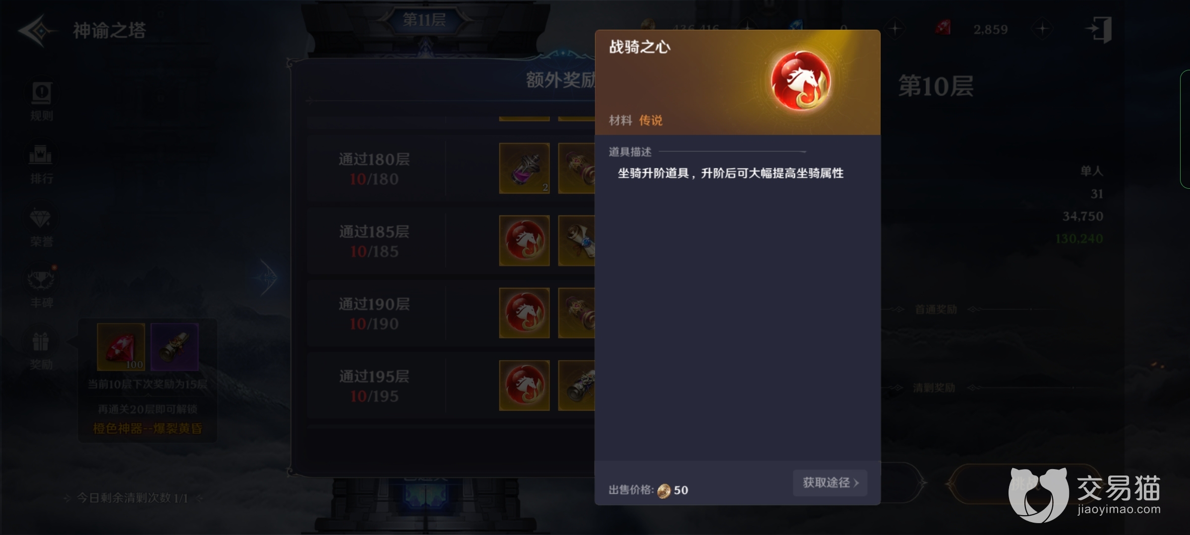 战骑之心可能没玩过的玩家不知道有什么用处,这个可是解锁坐骑属性以及技能的重要手段,游戏里依靠爬塔获取在游戏里是比较稀有的材料三个可以让玩家的的坐骑提升一个战力了,玩家需要多多收集。