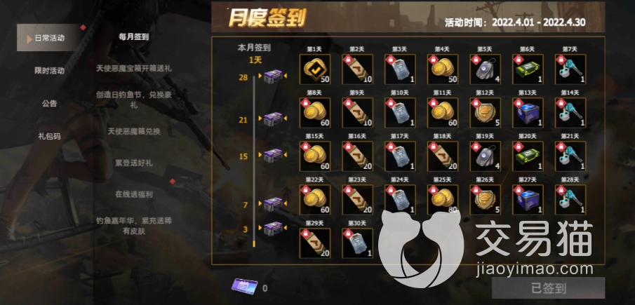 2022年9月8日-2022年10月10日为签到礼包,每天前往签到即可领取,签到15天可以领到金币128枚,此外还有两个武器的延长版体验卡:30天的恶作小鬼版猛兽火箭筒,15天的祥瑞国风版M4。