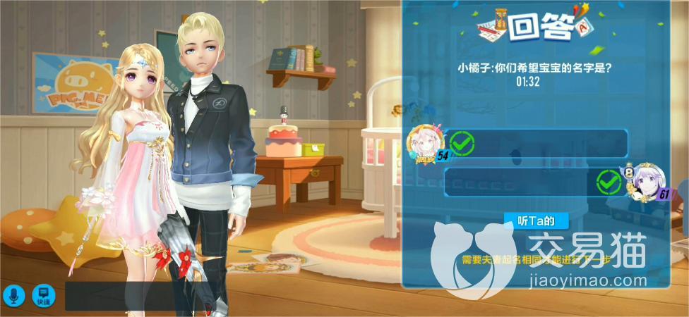 伴侣有一分钟的时间决定是否接受邀请,如果接受了邀请,二人就会进入婴儿房,此时会有NPC对双方提出问题,双方回答问题的答案需要一致,如果不一致则需要重答。