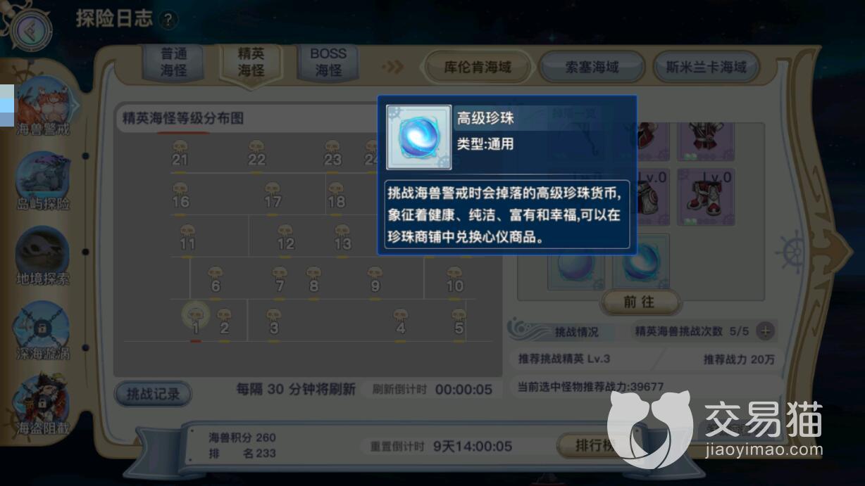 玩家们进入到探险日志当中,与各种精英海怪进行战斗就可以得到数量不一的高级珍珠。不过,该模式下的敌人战斗难度很大,玩家们至少要保证队伍的战斗力保持在二十万左右在考虑。否则进入到副本之后,是没有办法对敌人造成有效伤害的。建议从培养英雄开始去不断提升队伍的整体战斗力。