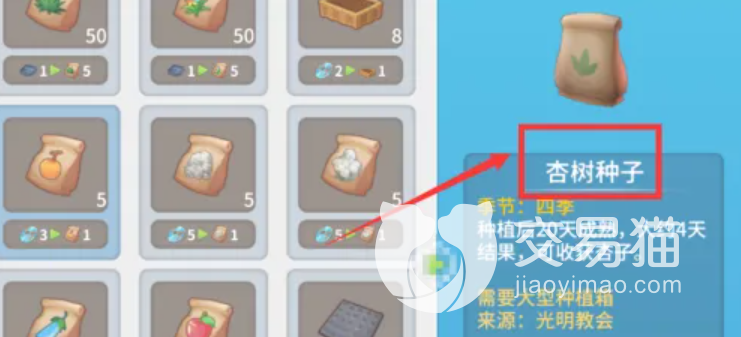 在光明教会中大家可以购买杏树种子,种子购买完成以后就可以在自己的家园中进行种植,种植的周期一般是十到二十天左右,等到杏树成熟大家就可以收货很多的杏子啦,这也是目前很多玩家用的一个获得途径。