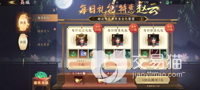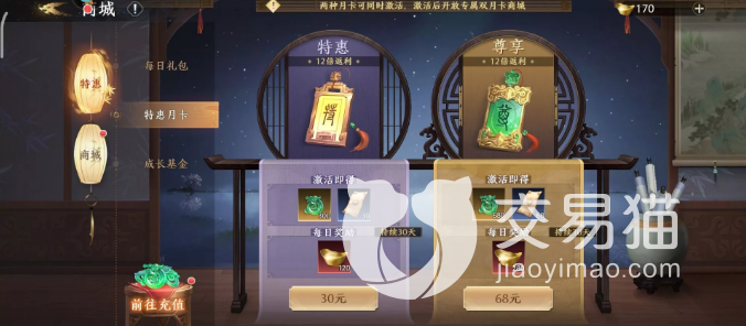 充值月卡有几个档次,特惠的月卡是最低等级的30就可以拿下,能够获得的主要其实是龙玉以及12倍的返利比较好,尊享等级是中等的68,龙玉也随之提升到680了,元宝直接从上一等级的3600到了8400相比之下其实尊享是比特惠要划算的,返利没有变化。