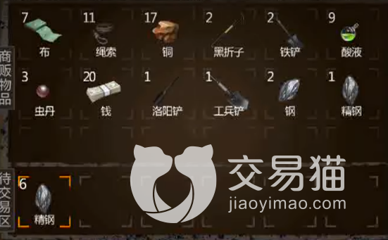 盗墓长生印猎户能够收购的道具有:布料,绳索,酸液,虫丝和僵尸肉这五种。