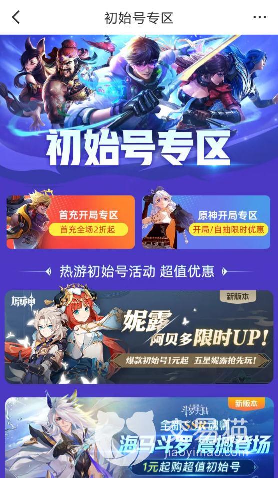 2、预算不多,也打算购买游戏账号的玩家,就可以直接进入到交易猫app当中的初始号专区。该专区下将为玩家们提供各大游戏的初始号,这一类账号虽然包含的游戏装备或者道具不多,但可以直接满足玩家们想要体验一款游戏的愿望,同时价格方面也十分经济实惠。