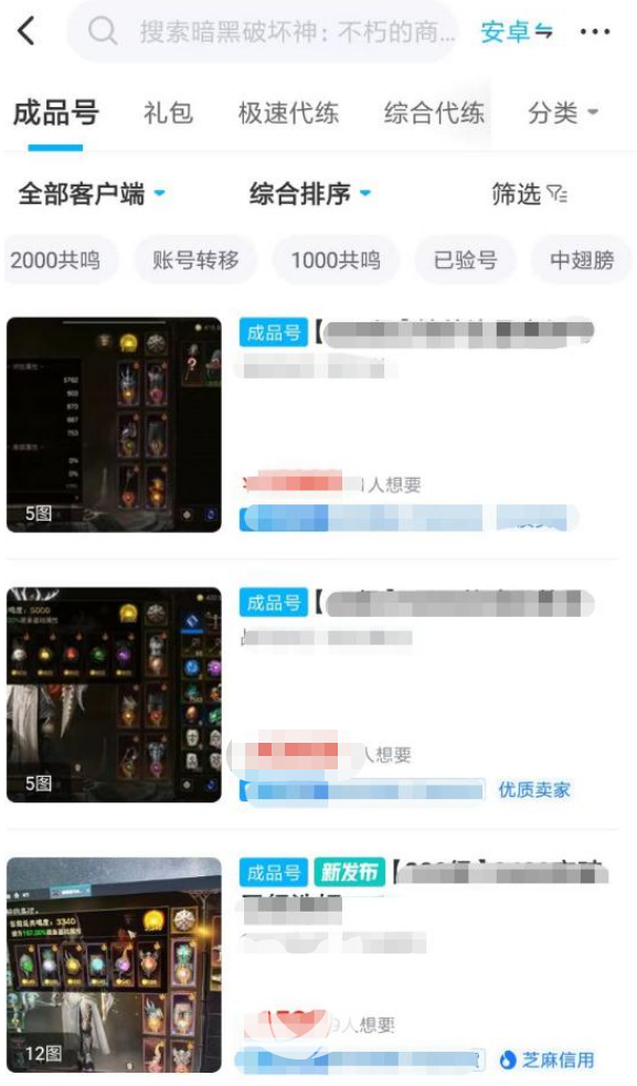 1、选择一个准备购买账号的游戏专区,进入之后就可以浏览到大量的账号交易信息。而此时玩家们要做的则是去分辨哪些商品的性价比较高,哪些商品更符合自己的要求。这些细节方面的信息,大家都可以直接进入到商品的详情页面当中去查看。