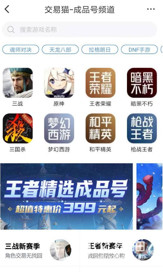 首先,可以满足用户们购买游戏账号的需求,同时又能够让大家在一个安全靠谱的环境中去得到自己喜欢的游戏商品,目前只有交易猫app能够帮助大家实现。想要购买到各种游戏账号的玩家,可以直接进入到交易猫app的成品号专区当中,在这里大家可以轻松获取到各种热门、冷门游戏的账号交易信息。
